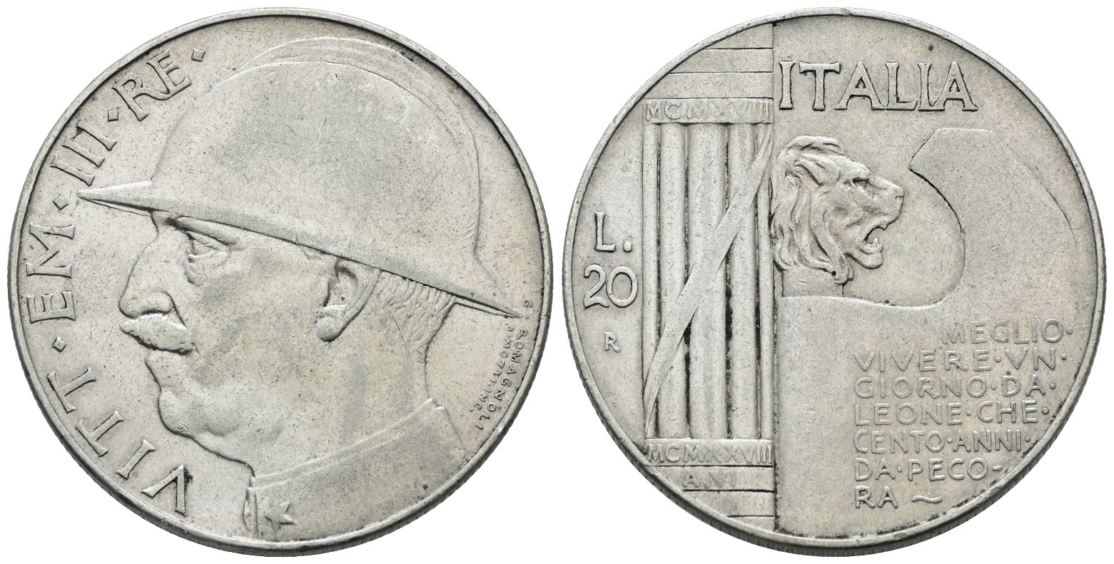 Lot 764 | REGNO D'ITALIA. Vittorio Emanuele III (1900-1943). 20 lire 1928 "Elmetto". Ag; 20gr; Gig.44; NC; BB