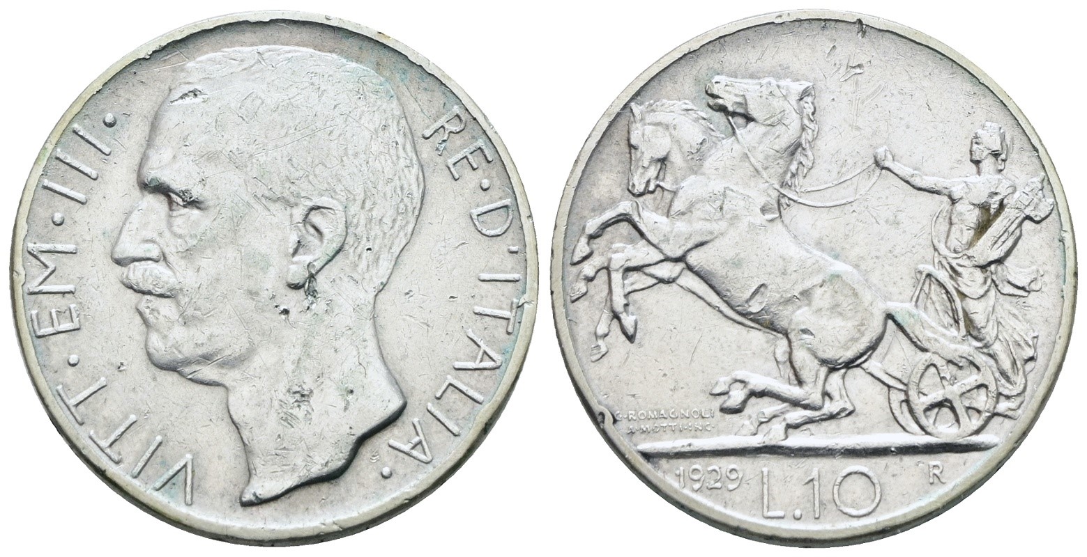 REGNO D'ITALIA. Vittorio Emanuele III (1900-1943). 10 lire 1929 "Biga"**. Ag; 10gr; Gig.58a; NC; Q.BB