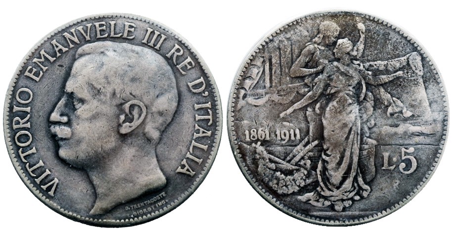 REGNO D'ITALIA. Vittorio Emanuele III (1900-1943). 5 lire 1911 "Cinquantenario". Ag; 25gr; Gig. 71; Raro; MB+