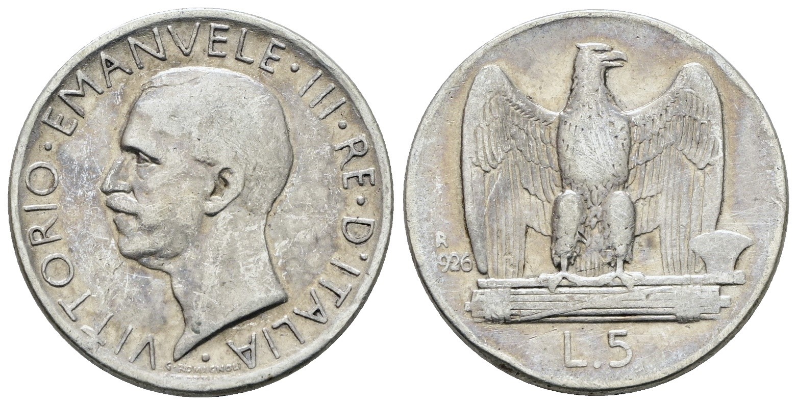 REGNO D'ITALIA. Vittorio Emanuele III (1900-1943). 5 lire 1926 "Aquilotto". Ag; 5gr; Gig.73; Raro; Q.BB