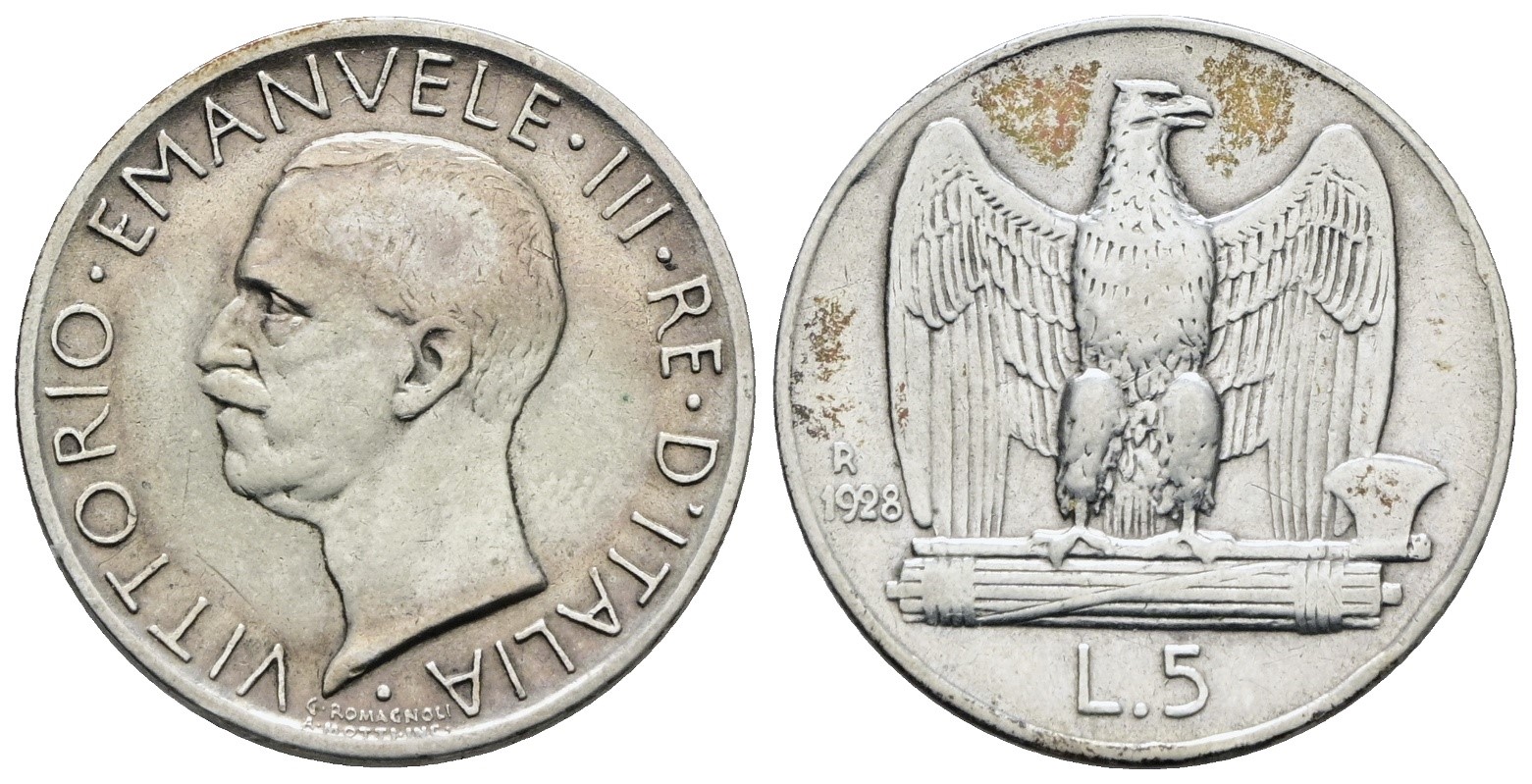 REGNO D'ITALIA. Vittorio Emanuele III (1900-1943). 5 lire 1928 "Aquilotto"**. Ag; 5gr; Gig. 75a; Raro; BB