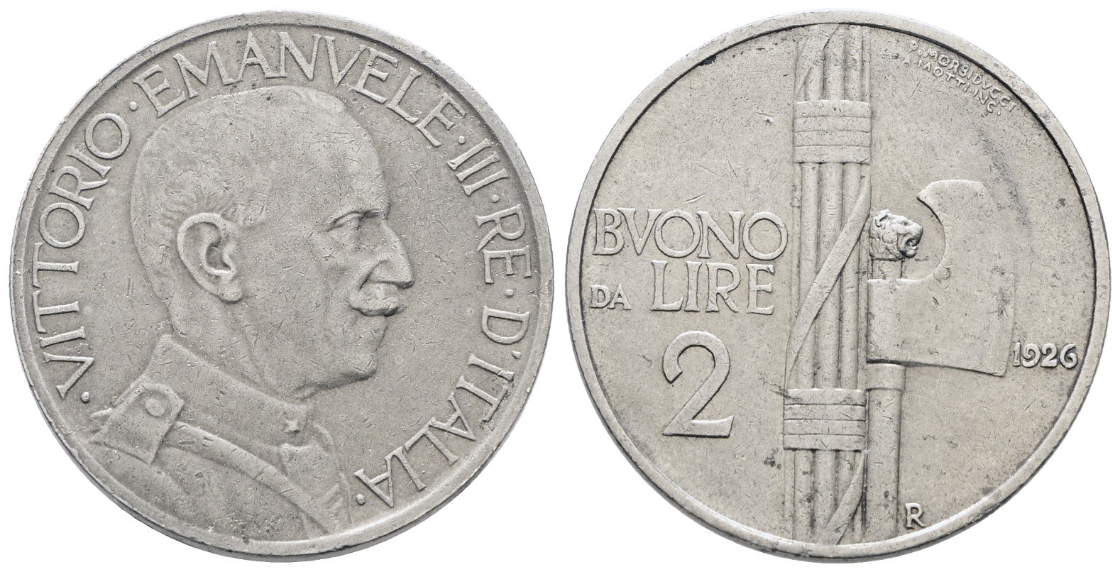 REGNO D'ITALIA. Vittorio Emanuele III (1900-1943). 2 lire 1926 "Fascio". Ni; Gig. 108; Raro; BB