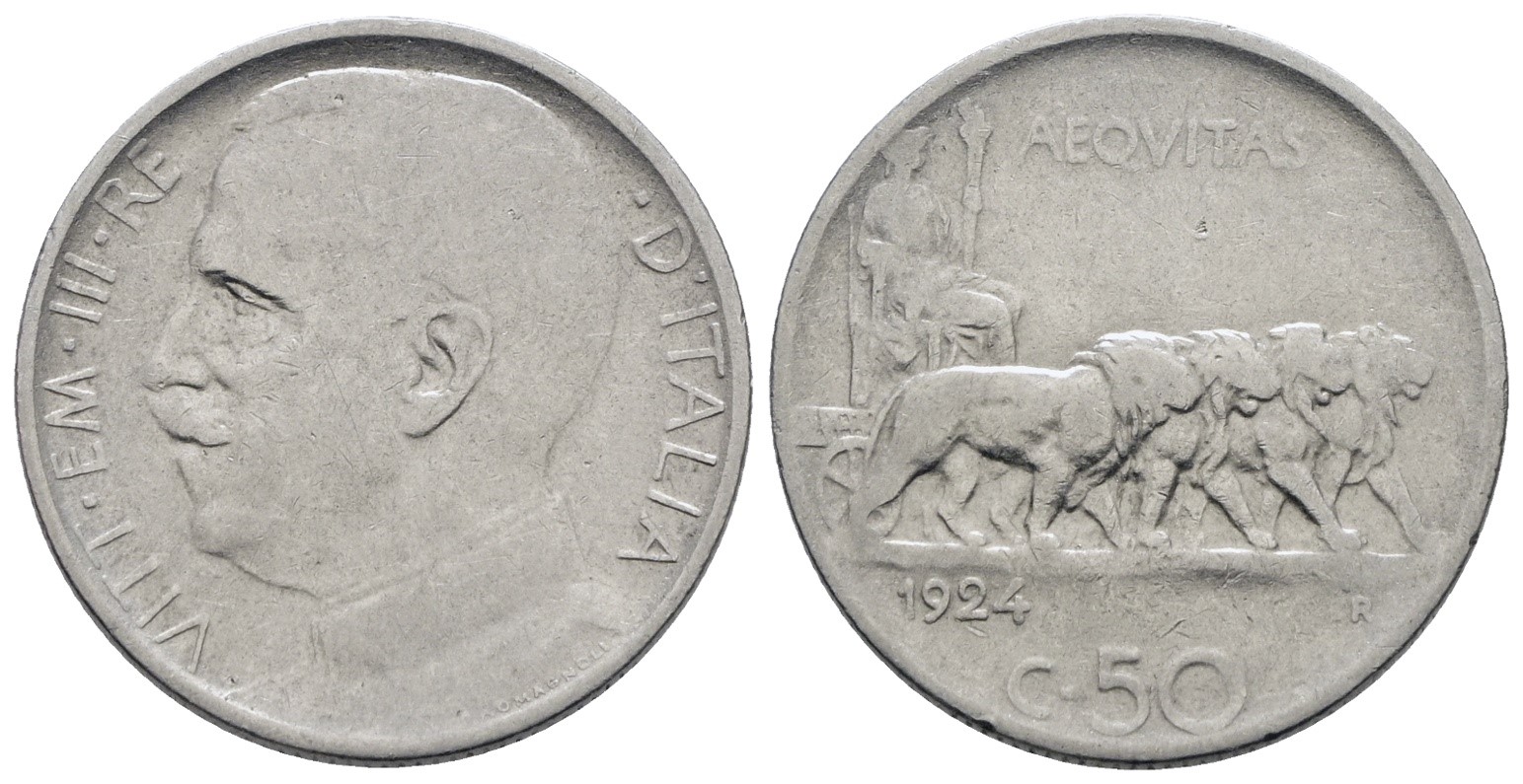 REGNO D'ITALIA. Vittorio Emanuele III (1900-1943). 50 centesimi 1924 rigato "Leoni". Ni; 6gr; Gig. 169; Raro; Q.BB