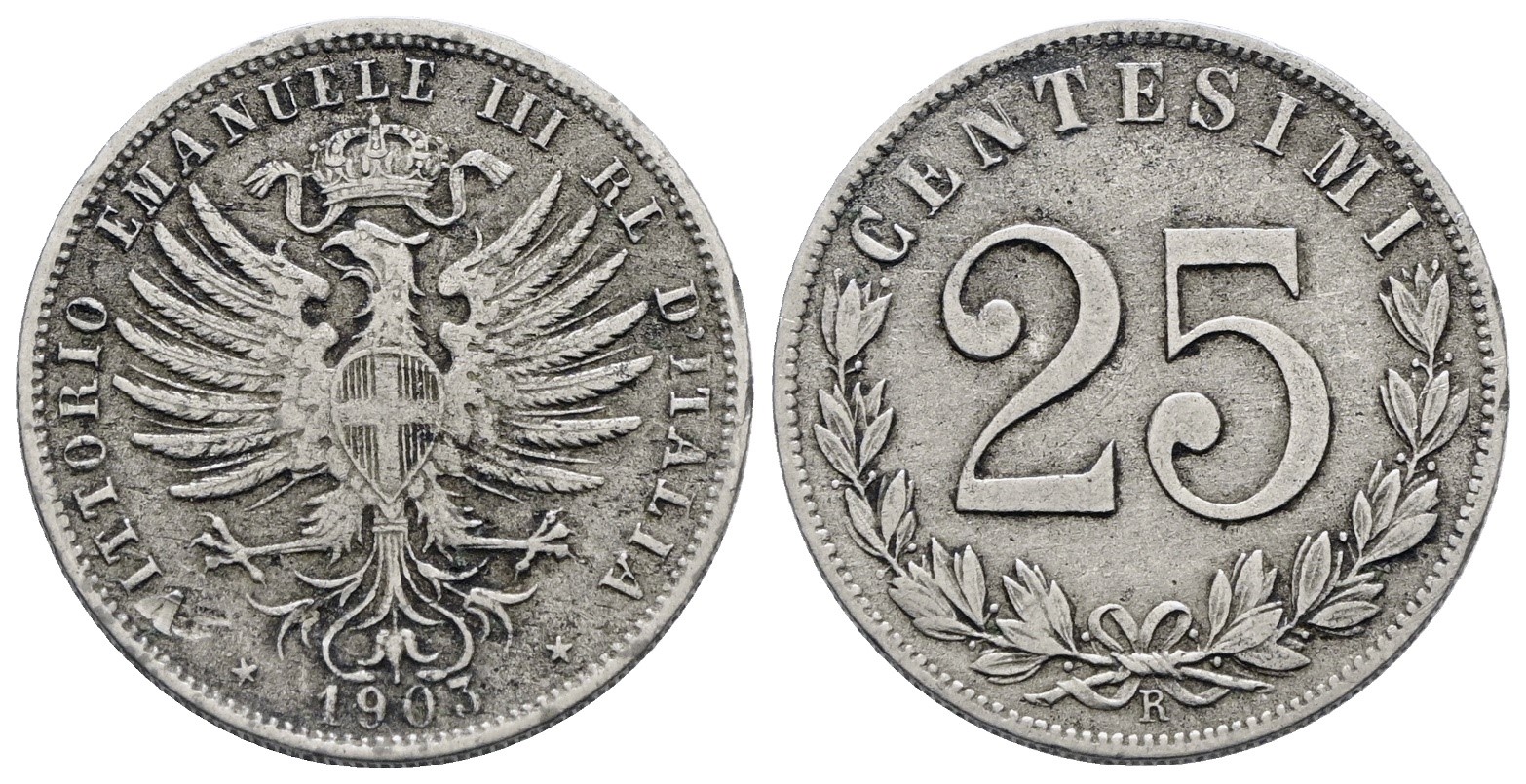 REGNO D'ITALIA. Vittorio Emanuele III (1900-1943). 25 centesimi 1903. Ni; 4gr; Gig. 192; Raro; BB