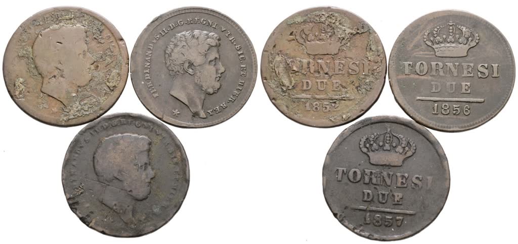 Lot 1349 | NAPOLI. REGNO DELLE DUE SICILIE. Ferdinando II di Borbone (1830-1859). Lotto di 3 monete da 2 tornesi 1852, 1856, 1857. Cu; Conservazioni varie.