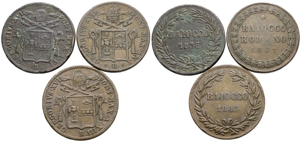 STATO PONTIFICIO. ROMA. Gregorio XVI (1831-1846). Lotto di 3 monete da 1 baiocco 1836-1831-1843. Cu; Conservazioni differenti.