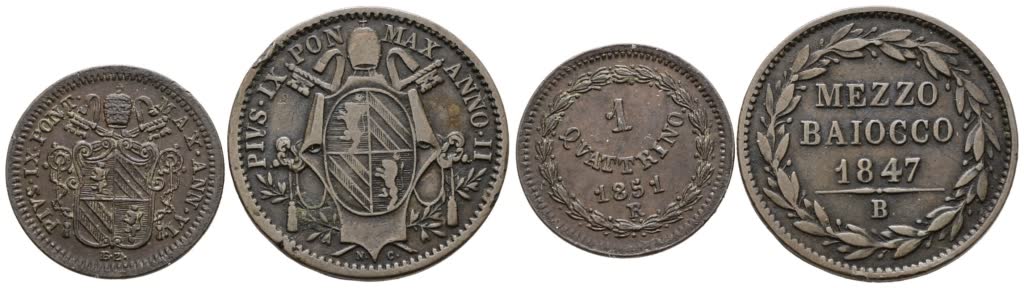STATO PONTIFICIO. Pio IX (1846-1870). Lotto di 2 monete da 1 quattrino 1851 R e mezzo baiocco 1847 B. Cu; Conservazioni differenti