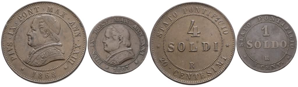 Lot 1389 | STATO PONTIFICIO. ROMA. Pio IX(1846-1870). Lotto di 2 monete da 4 soldi e 1 soldo. Cu; Anni e conservazioni differenti