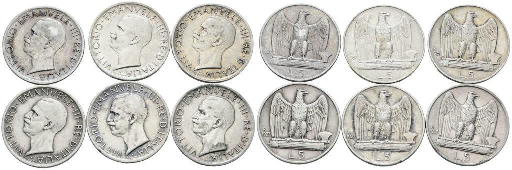 REGNO D'ITALIA. Vittorio Emanuele III (1900-1943). Lotto di 6 monete da 5 lire "Aquilotto". Ag; Date e conservazioni varie.