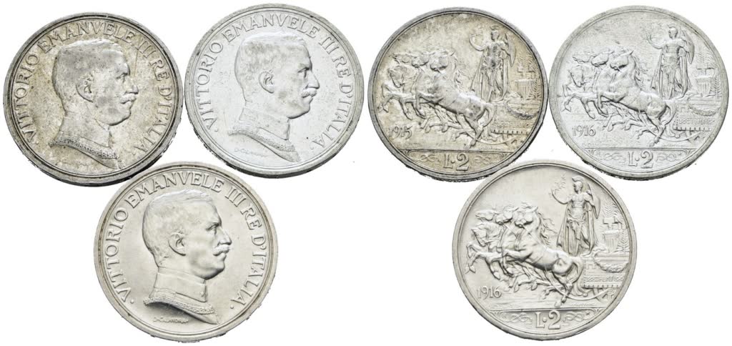 REGNO D'ITALIA. Vittorio Emanuele III (1900-1943). Lotto di 3 monete da 2 lire "Quadriga briosa" 1915, 1916, 1916. Ag; Conservazioni varie.