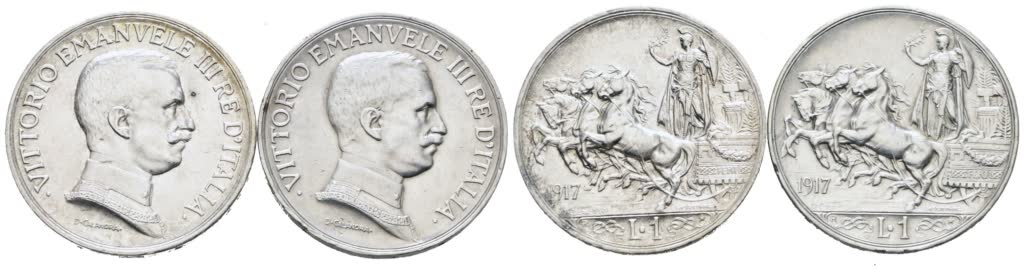 REGNO D'ITALIA. Vittorio Emanuele III (1900-1943). Lotto di 2 monete da 1 lira 1917 "Quadriga briosa". Ag; Gig. 139; Conservazioni varie