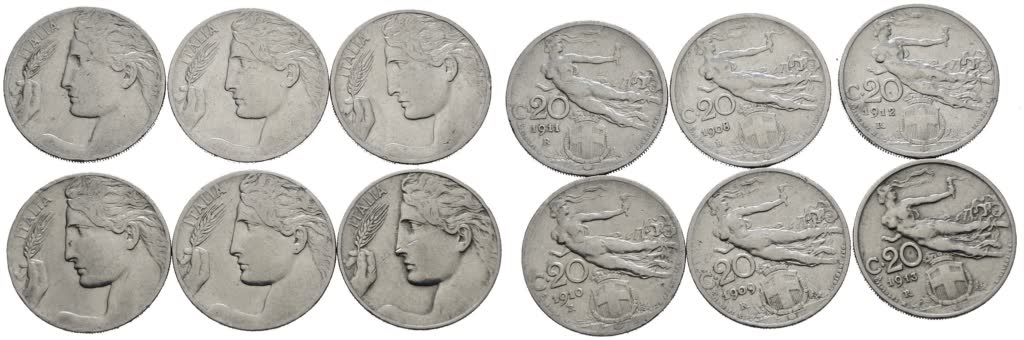 REGNO D'ITALIA. Vittorio Emanuele III (1900-1943). Lotto di 6 monete da 20 centesimi "Libertà librata". Ni; Date e conservazioni varie