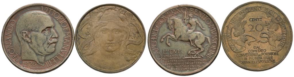 REGNO D'ITALIA. Vittorio Emanuele III (1900-1943). Lotto di 2 monete da 2 lire 1928 "Esposizione di Milano"; 20 centesimi 1906 "Esposizione di Milano". Cu. Conservazioni varie