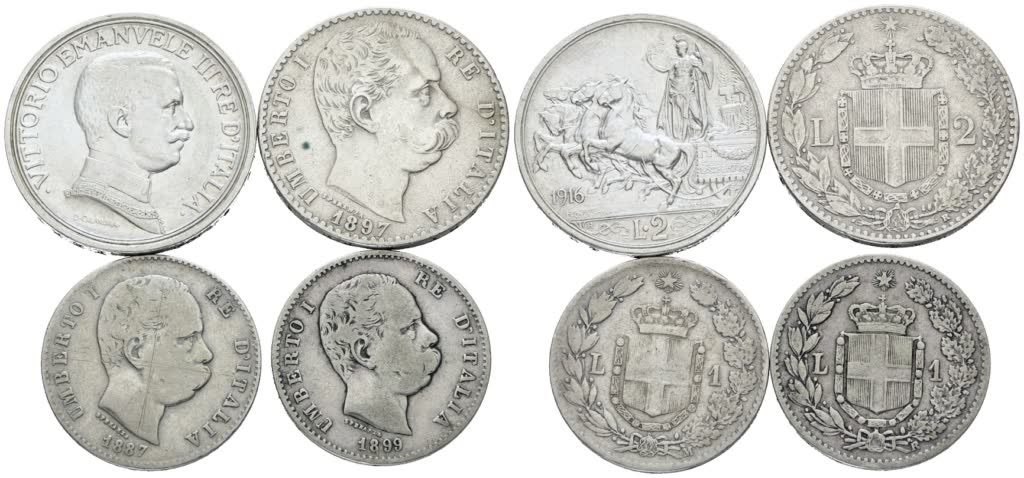 REGNO D'ITALIA. Lotto di 4 monete in argento da 2, 1 lira. Ag; Varie conservazioni.