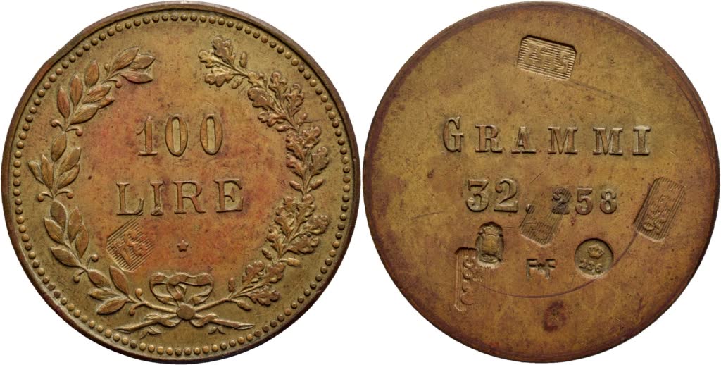 SAVOIA - Peso monetale 100 Lire Ø: 30 mm. - (BR g. 32,23) R Interessanti contromarche. qFDC