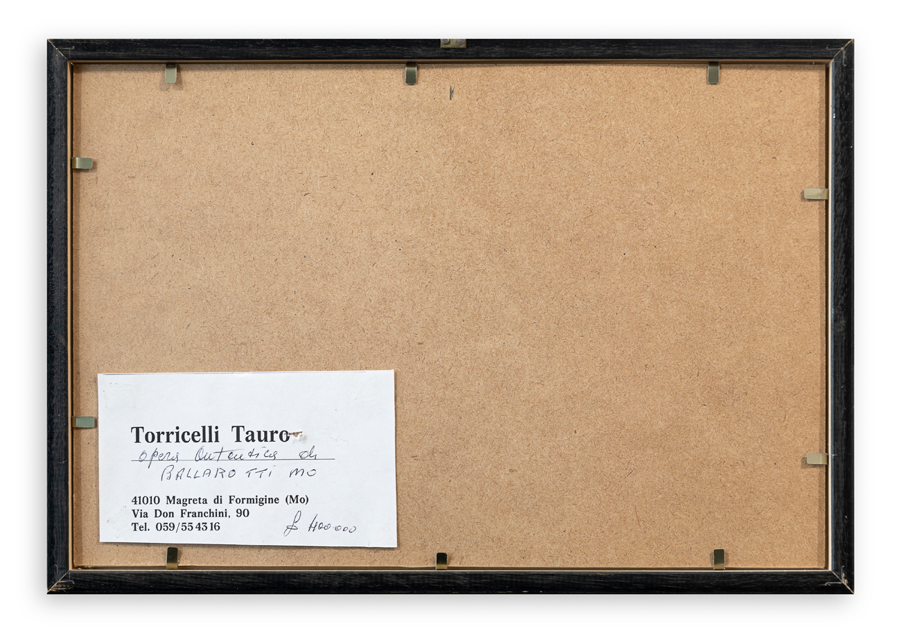 Etichetta della Collezione Tauro Torricelli (MO) al retro della tavola protettiva