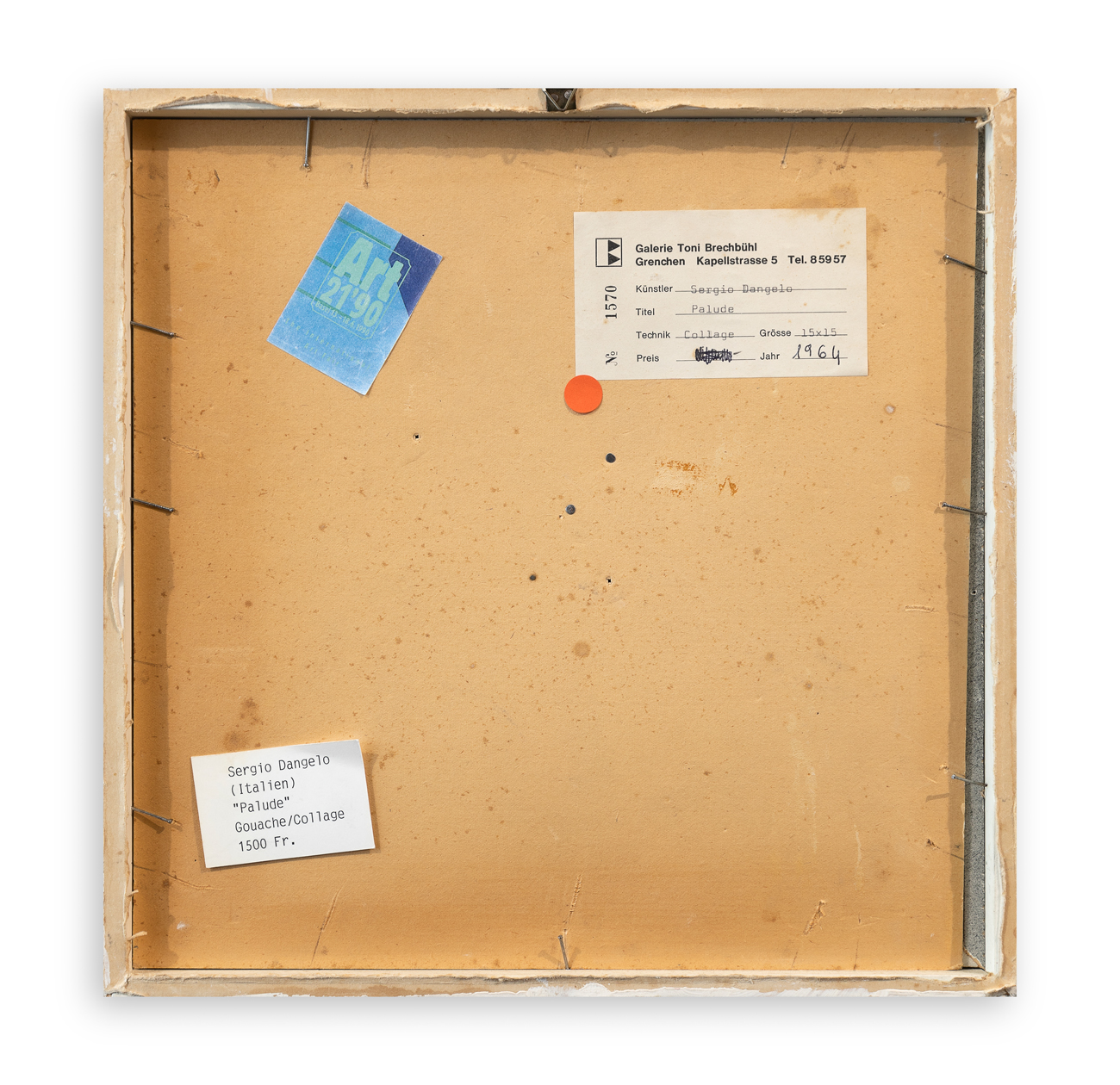 Etichetta della Galerie Toni Brechbühl (Grenchen), con caratteristiche tecniche dell'opera e numero di repertorio, al retro del cartone protettivo