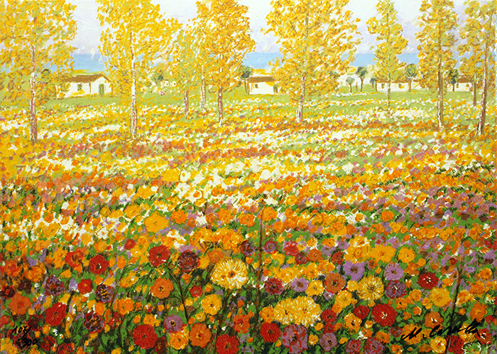 MICHELE CASCELLA , Prato Fiorito, anno 1984, Serigrafia e litografia a 34 passaggi di colore, tiratura 300 esemplari in numeri romani + C numeri romani e alcune prove d'autore, esemplare 114/300. (La prima immagine è solo a scopo illustrativo)