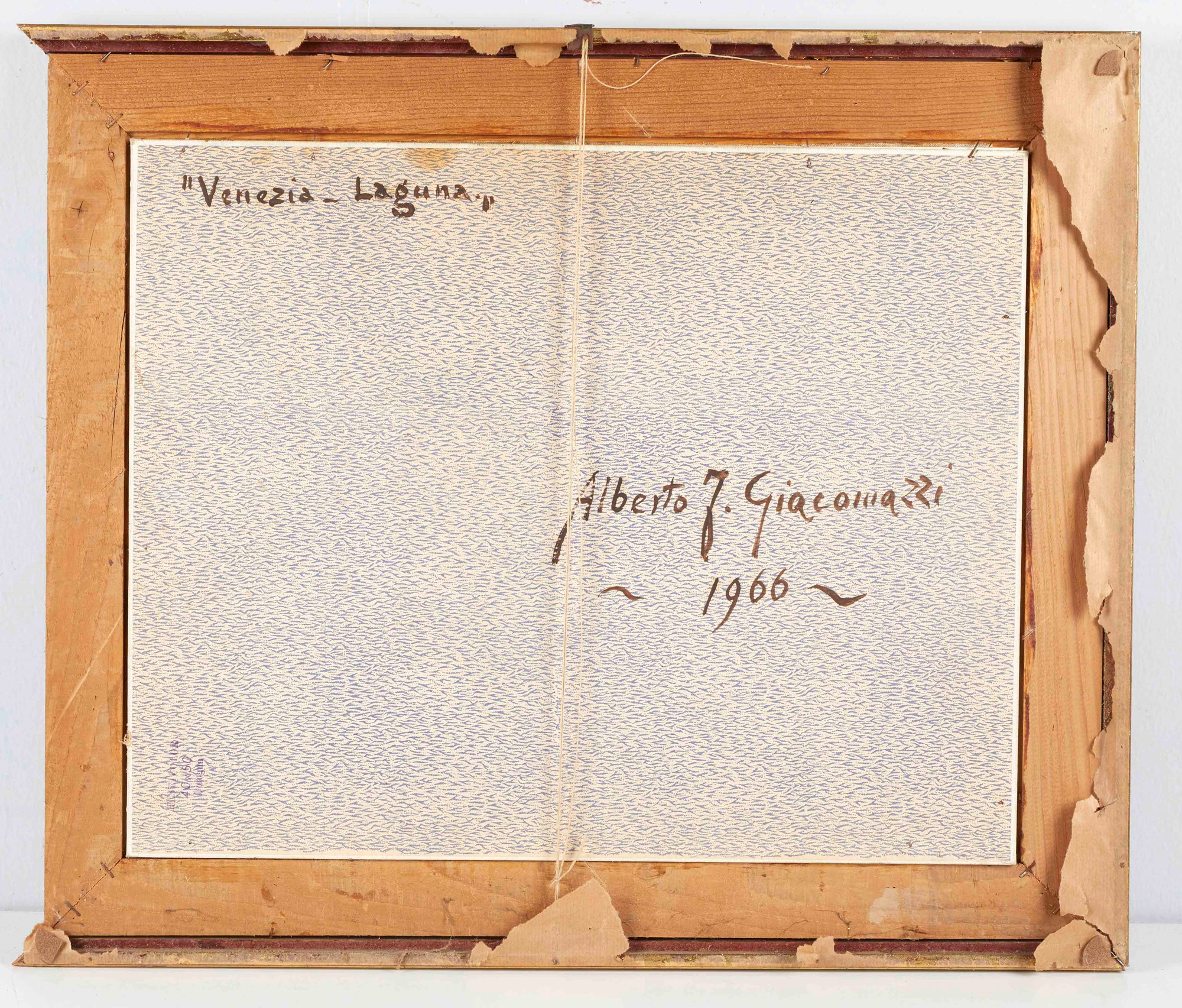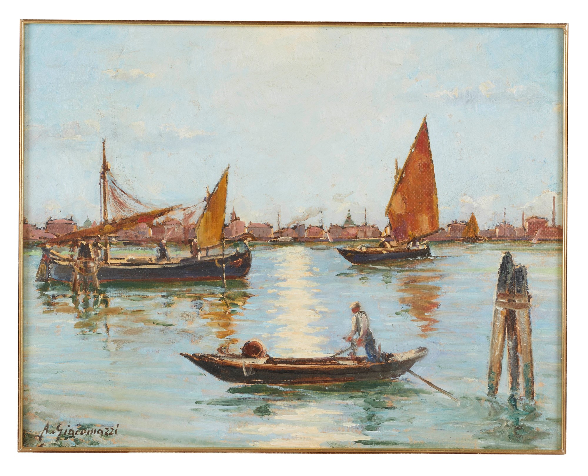 ALBERTO GIACOMAZZI (Venezia 1890 - Bologna 1969) "Venezia - Laguna", 1960. Olio su tela applicata su tavola. Cm 40x50. Opera firmata in basso a sinistra A. Giacomazzi. Opera intitolata, firmata e datata al retro.