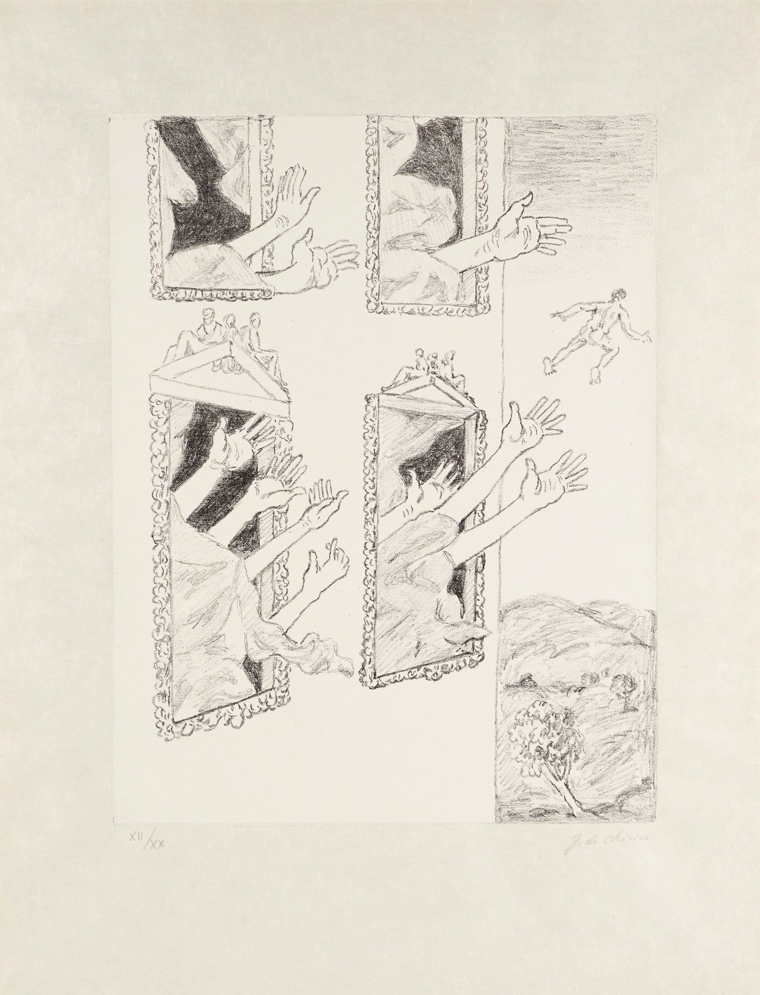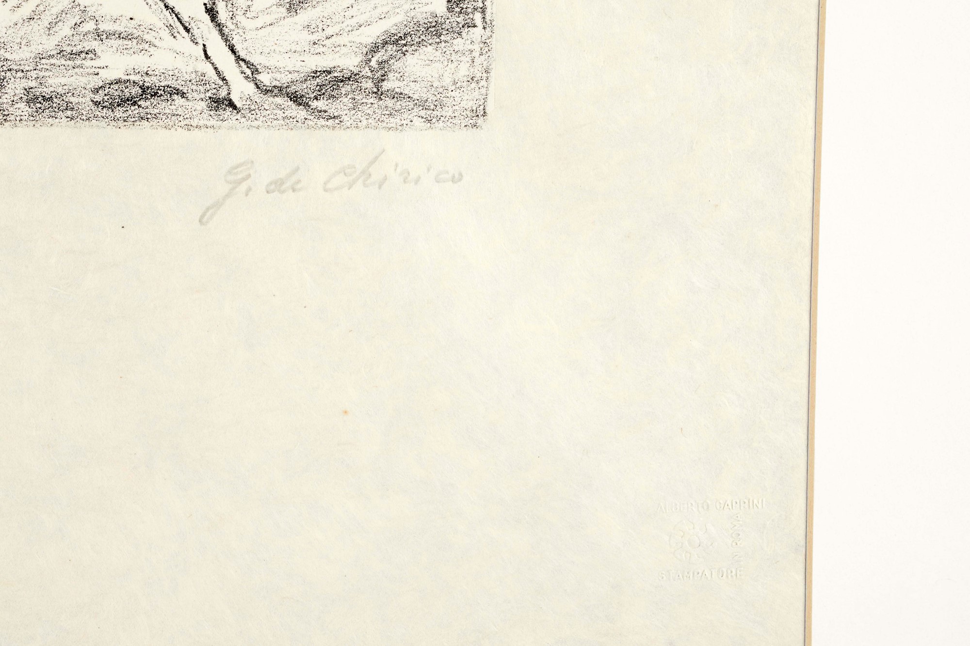 GIORGIO DE CHIRICO (Volos 1888 – Roma 1978) “Le mani misterioso”, 1973. Litografia su carta japon. Cm 45,5x35. Opera firmata in basso a destra G. de Chirico. Reca numeri di tiratura in basso a sinistra XII/XX. Reca timbro a secco di Alberto Caprini Stampatore Roma in basso a destra. Reca timbro a secco Giorgio de Chirico in basso a sinistra.