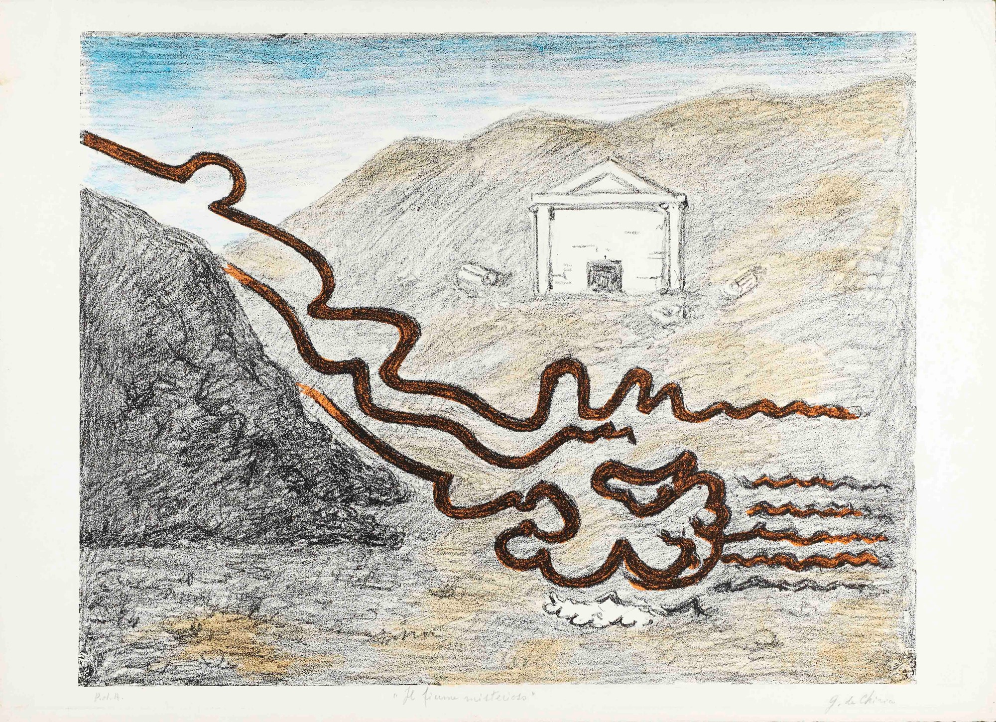 GIORGIO DE CHIRICO (Volos 1888 – Roma 1978) “Il fiume misterioso”, 1969. Litografia a 4 colori su carta. Cm 50,5x70. Opera firmata in basso a destra G. de Chirico. Reca numeri di tiratura in basso a sinistra p.da. Opera intitolata in basso al centro Il fiume misterioso. Reca timbro a secco di Alberto Caprini Stampatore Roma in basso a destra. Reca timbro a secco Giorgio de Chirico in basso a sinistra