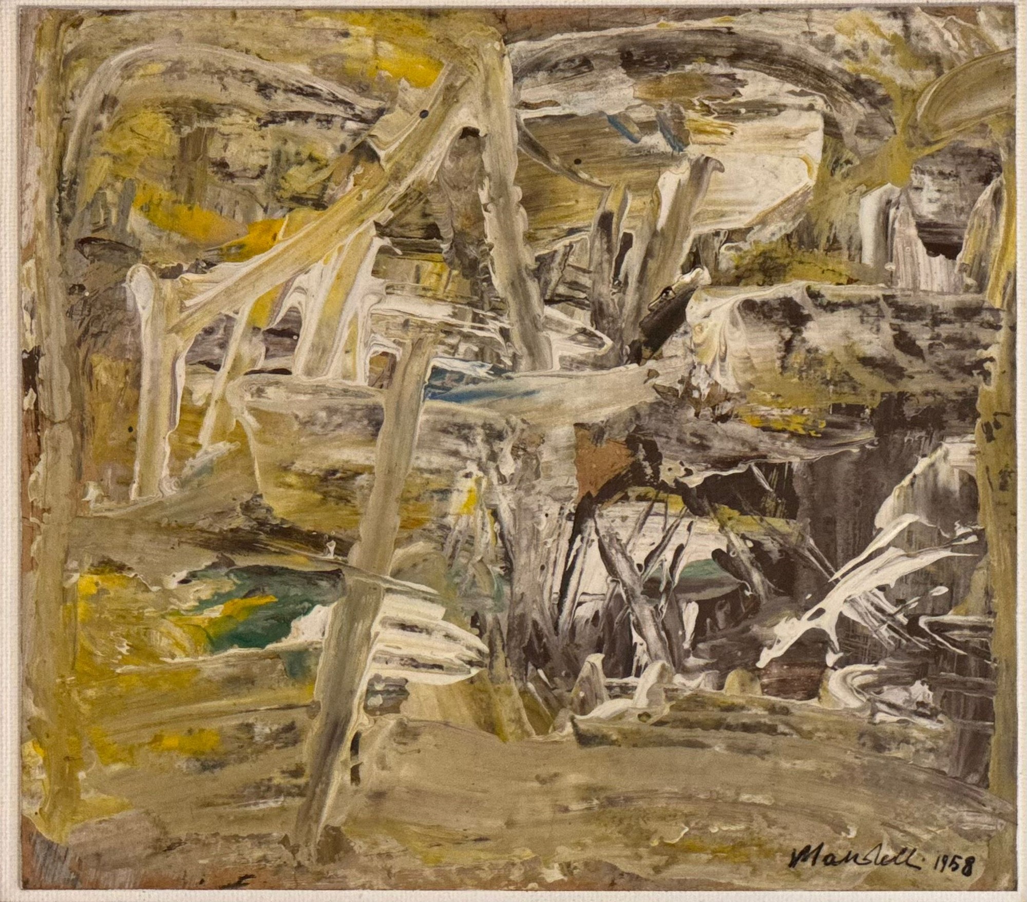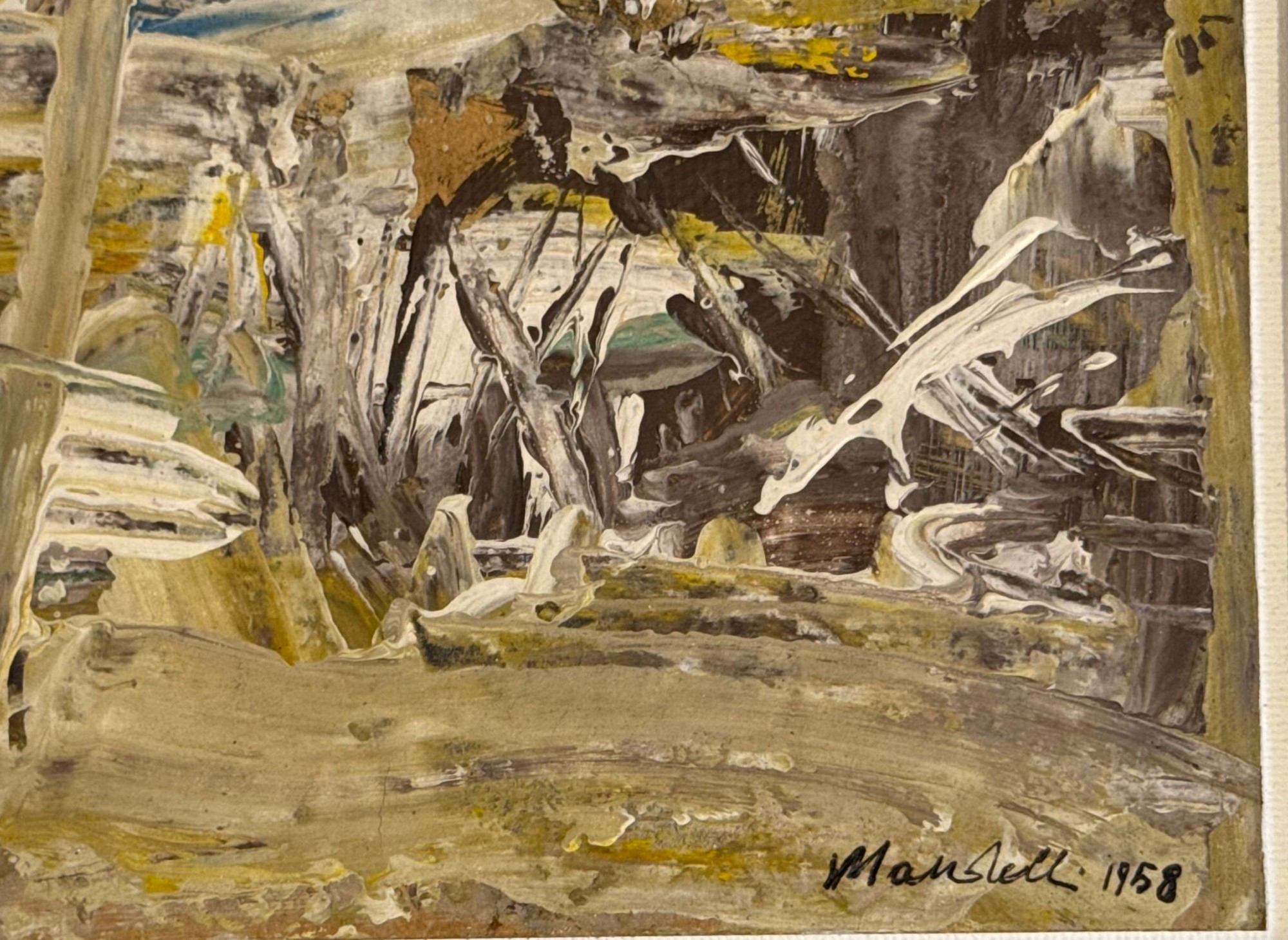 POMPILIO MANDELLI (Luzzara 1912 - Bologna 2006) "Paesaggio informale", 1958. Olio su tavola. Cm 21,5x24,5. Opera firmata e datata in basso a destra Mandelli 1958.