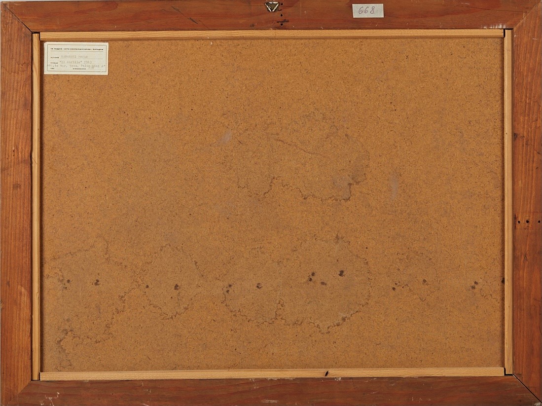 PAOLO MANARESI (Bologna 1908 - Bologna 1991) "Il cortile", 1963. Incisione su carta. Cm 50x70. Opera firmata in basso a destra Paolo Manaresi. Reca numeri di tiratura in basso a sinistra 6/30. Al retro reca etichetta Grafica Studio, Via Farini, Bologna.