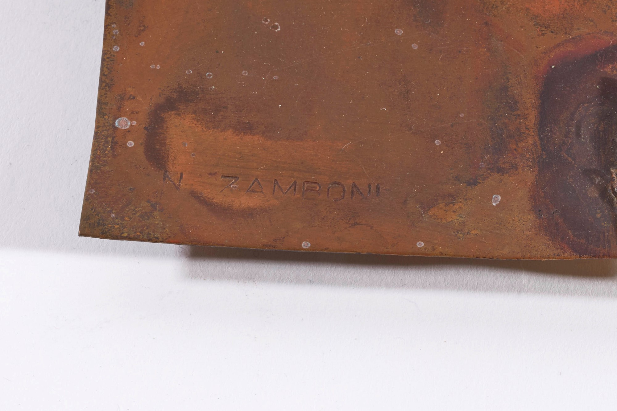 NICOLA ZAMBONI (Bologna 1943 - 2023) "Biglietto d'auguri", 2008. Scultura in rame. Cm 7x22,5x11. Opera firmata e datata N. Zamboni, 2008.