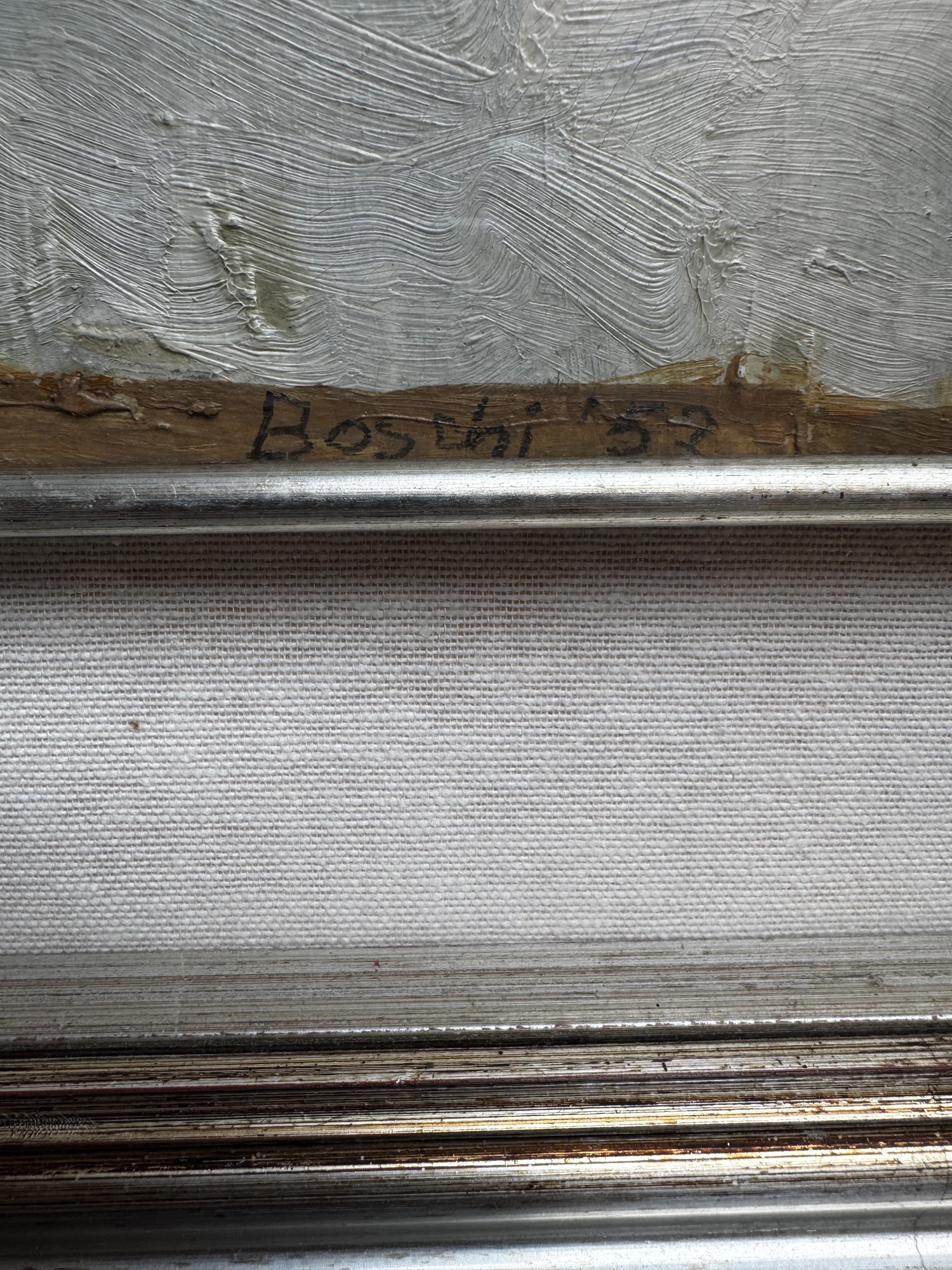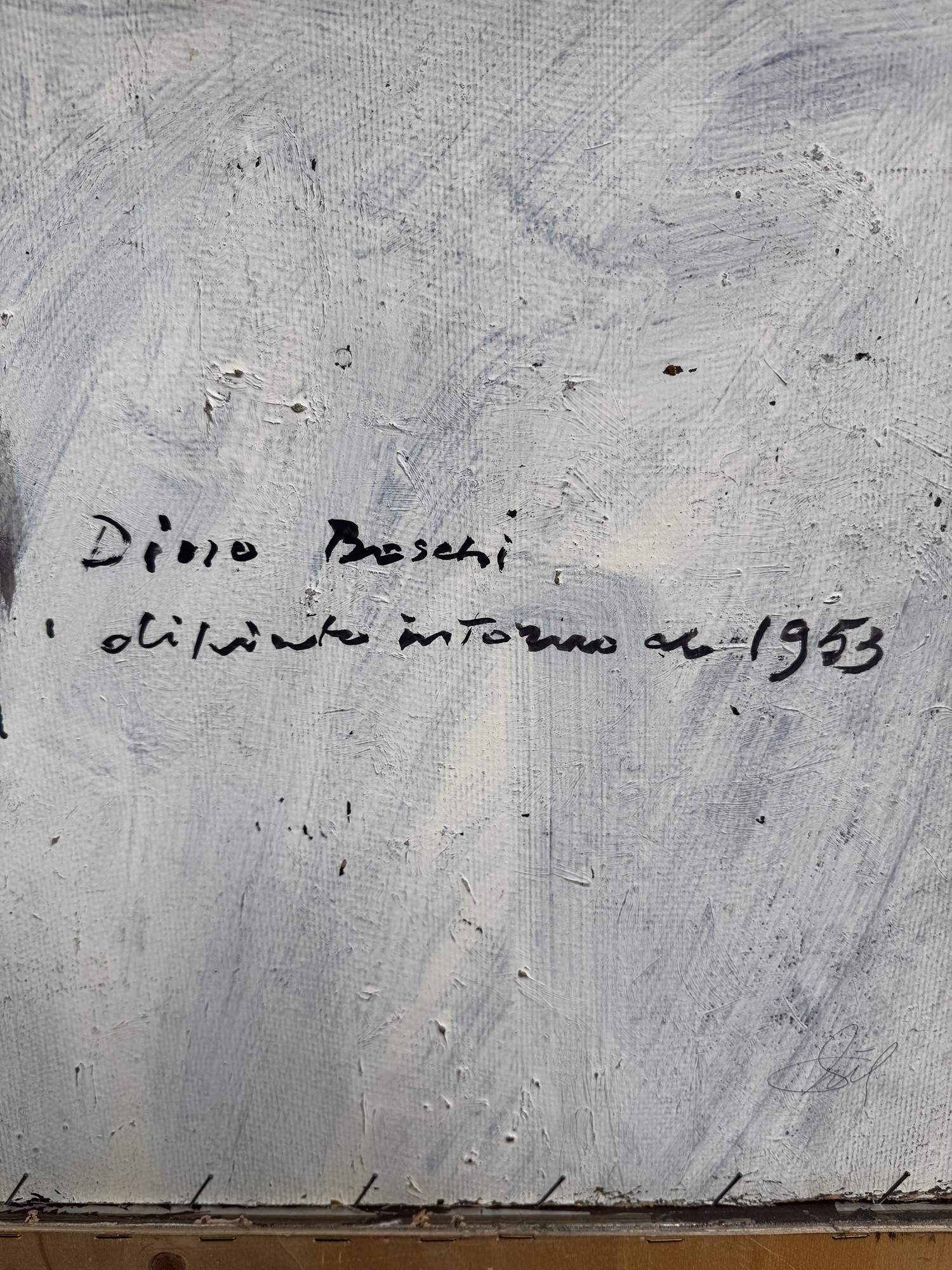 DINO BOSCHI (Bologna 1923 - Bologna 2015) "Natura morta", 1953. Olio su faesite. Cm 40x50. Opera firmata e datata in basso a destra Boschi '53. Al retro opera firmata e datata Dino Boschi 1953.