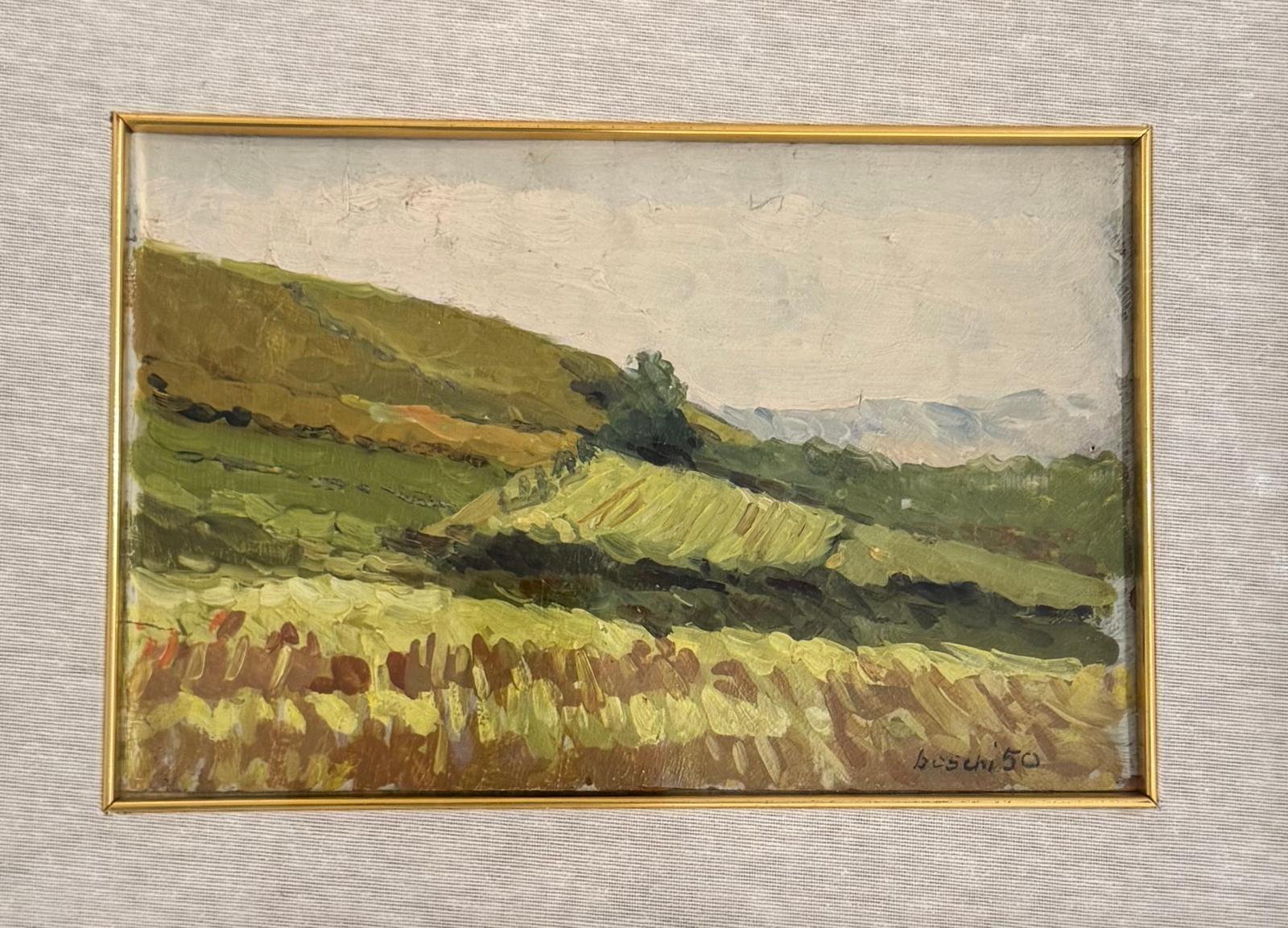 DINO BOSCHI (Bologna 1923 - Bologna 2015) “Paesaggio”, 1950. Olio su cartone. Cm 21x31. Opera firmata e datata in basso a destra Boschi '50.
