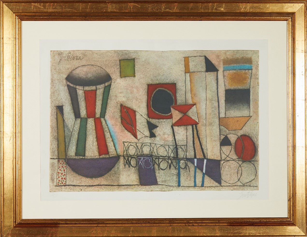 Franco Gentilini (Faenza 1909 - Roma 1981) "Senza titolo". Litografia a colori su carta. Cm lastra: 46x68. Opera firmata in basso a destra Gentilini. Reca numeri di tiratura in basso a sinistra 23/200.