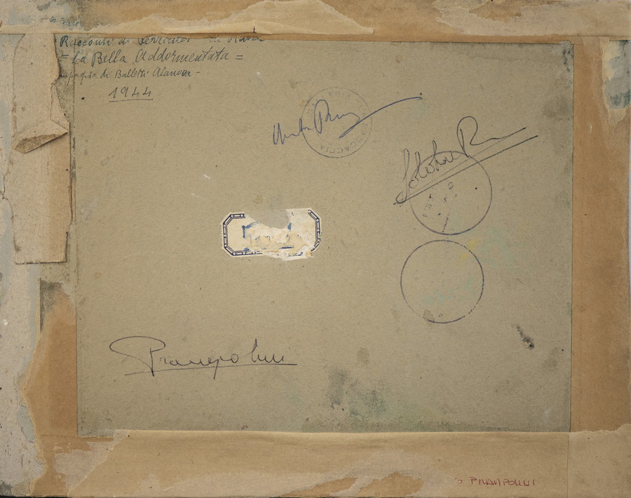 PRAMPOLINI ENRICO (1894 - 1956) SCENOGRAFIA "LA BELLA ADDORMENTATA". 1944. Tecnica mista su cartoncino applicato su cartone. Cm 30,20 x 23,00. sul retro: firma, data, titolo e timbro Galleria La Barcaccia, Roma