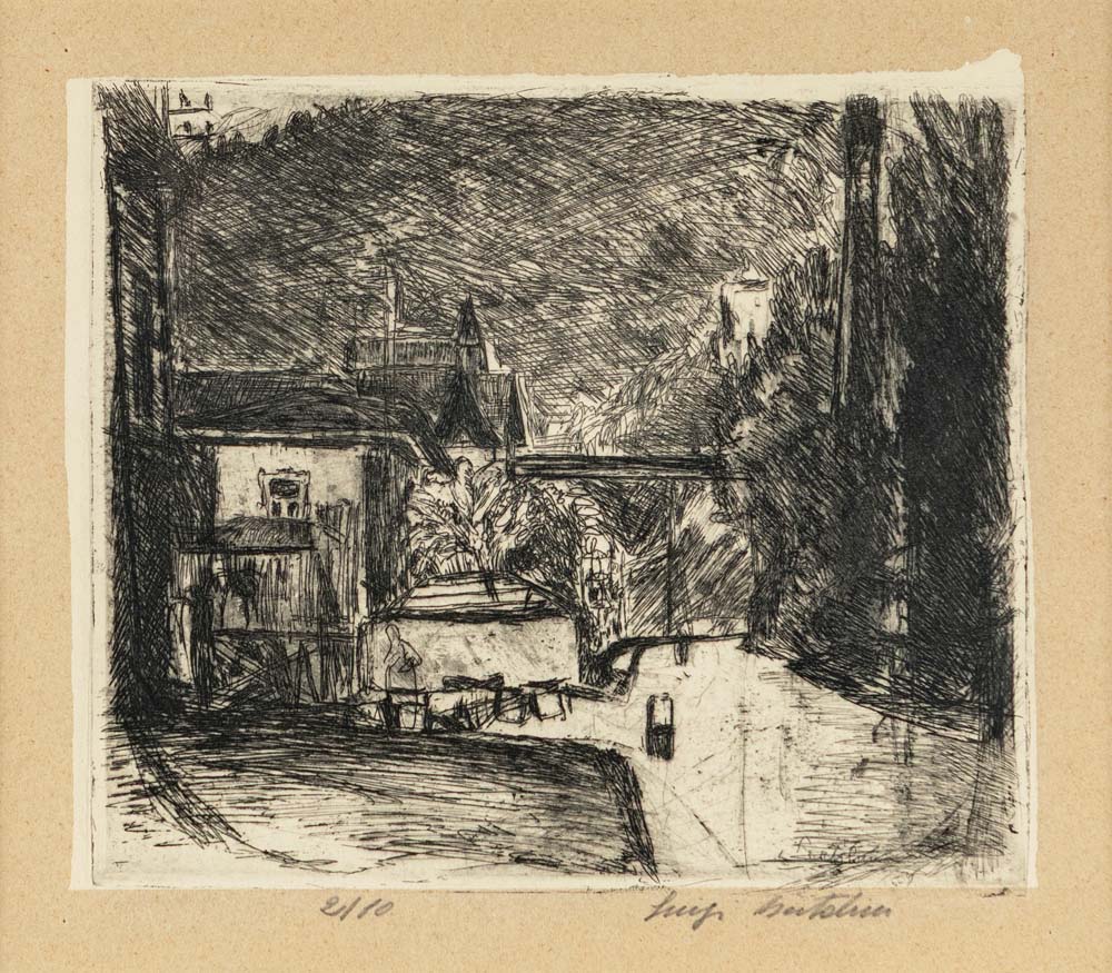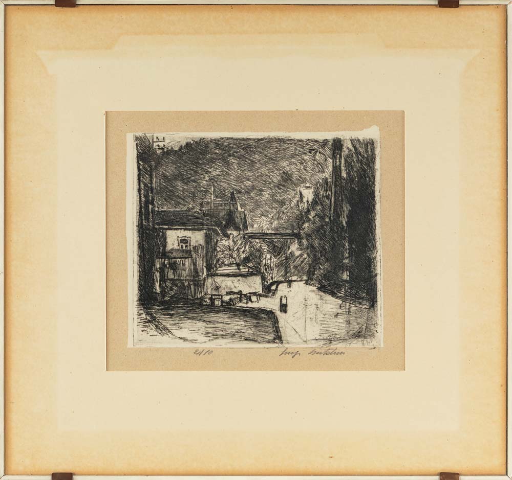 Veduta di Merano Firma e numerazione a matita "Luigi Bartolini 2/10". In lastra L. Bartolini.  Incisione acquaforte cm 16,5x19 (lastra) - in cornice cm 36x39
