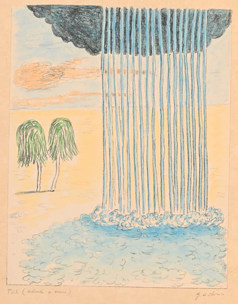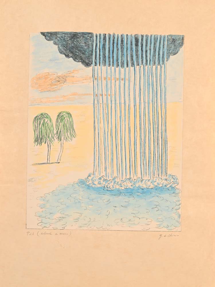 La pioggia deserto 1973 Firma e numerazione "G. De Chirico p.d.a. colorata a mano". Timbro a secco "Giorgio De Chirico" e "Alberto Caprini stampatore in Roma".  Litografia e acquarello su carta Japon cm 66x50