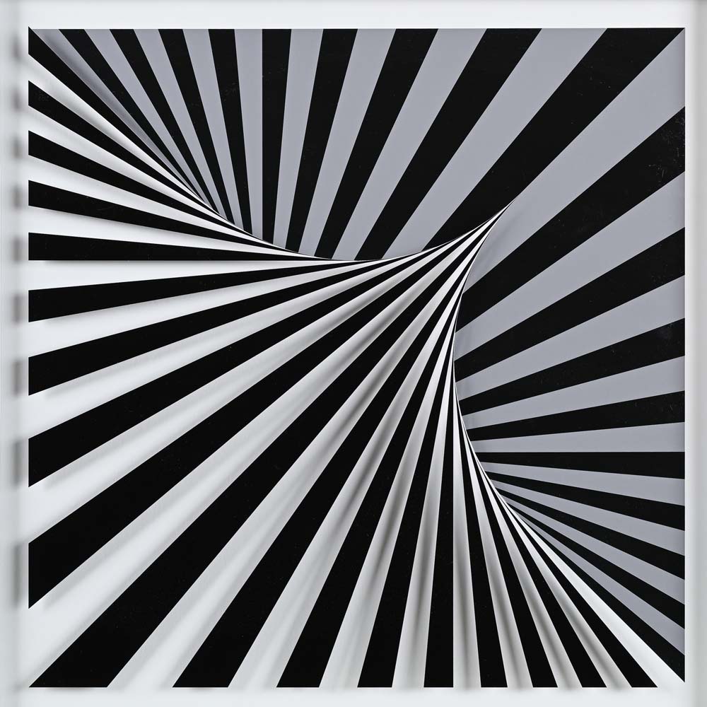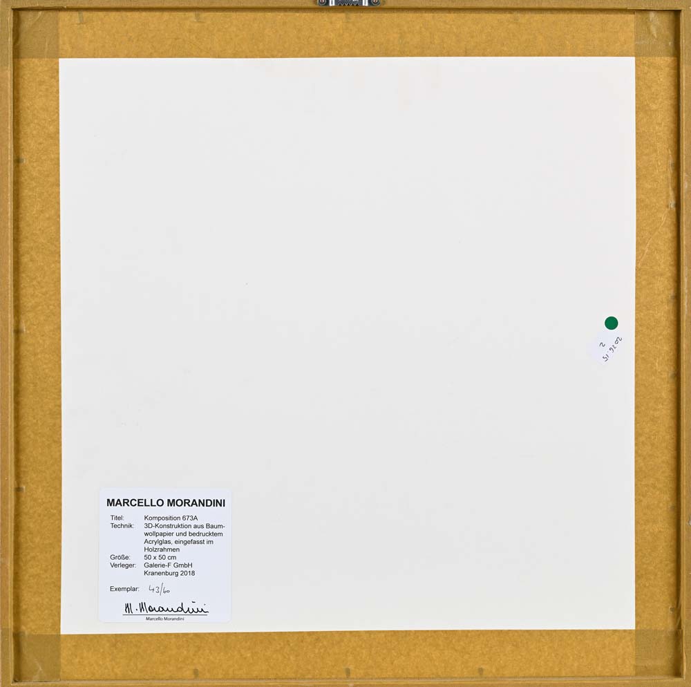 Komposition 673A 2018 Al verso reca cartiglio di Marcello Morandini con specifiche tecniche, numerazione a pennarello 43/60 e firma a pennarello "M. Morandini". Edizioni Galerie-F Gmbh Kranenburg 2018 Costruzione 3d in carta cotone e vetro acrilico stampati cm 50x50 - in cornice cm 52x52
