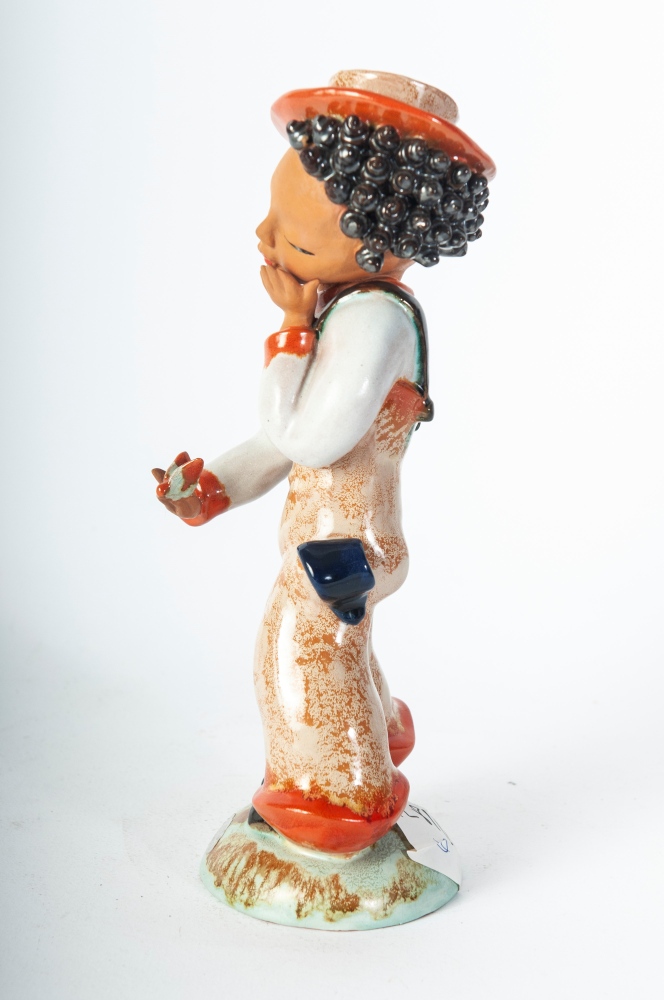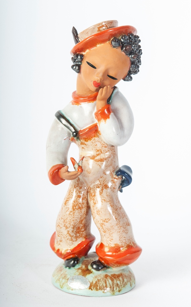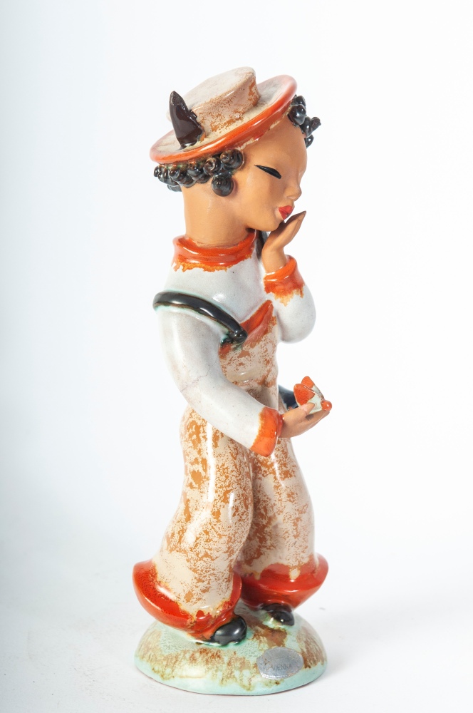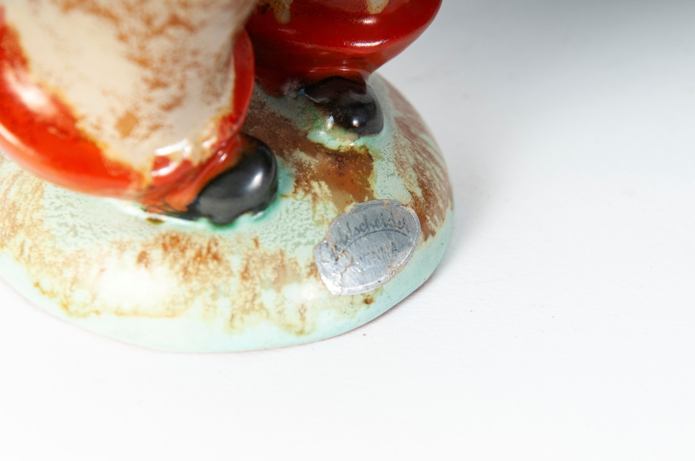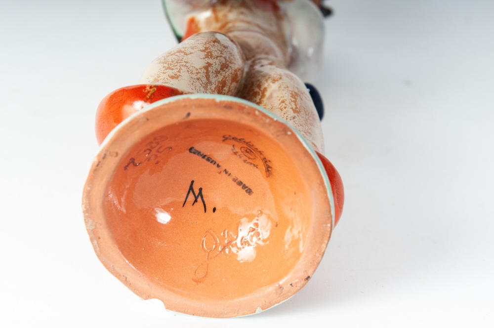 25 x 8 cm scultura a tutto tondo in ceramica policroma con formatura a colaggio. Firma in nero alla base sotto smalto. Manifattura Gold Schaider Vienna.
