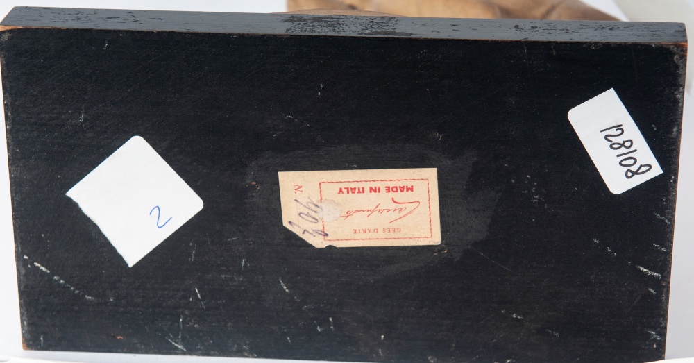 36,6 x 24 x 23 cm scultura in gress a tutto tondo con base in legno ebanizzato. Formatura a colaggio. Firmato alla base G. Cacciapuoti e numero di serie su etichetta rossa.