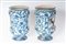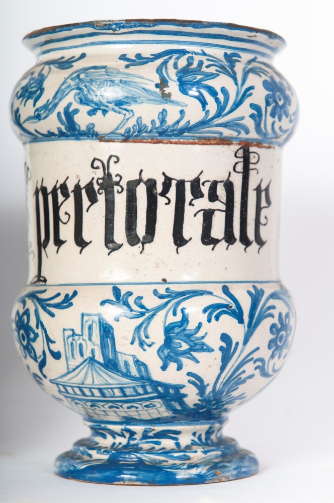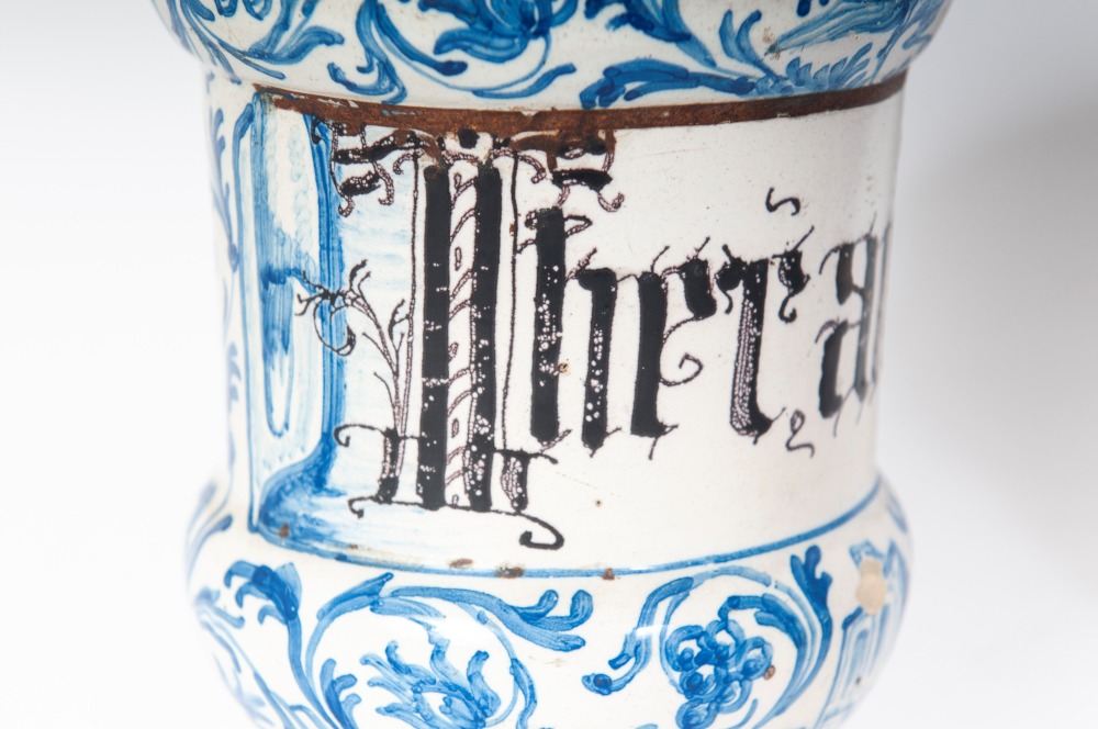 20 x 12 x 9,5 cm albarelli dal corpo a rocchetto con piede ad anello e orlo superiore estroflesso, decoro a girali fitomorfe su fondo bianco. Iscrizione apotecaria in bruno di manganese entro cartiglio.