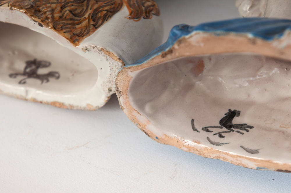 23 x 17,5 x 8 cm; 18 x 18 x 10 cm in ceramica policroma, modellati a tutto tondo con formatura a colaggio. Manifattura Cantagalli Firenze, inizi XX secolo