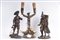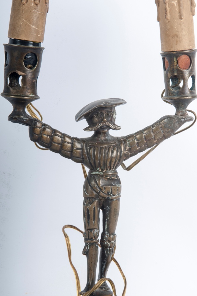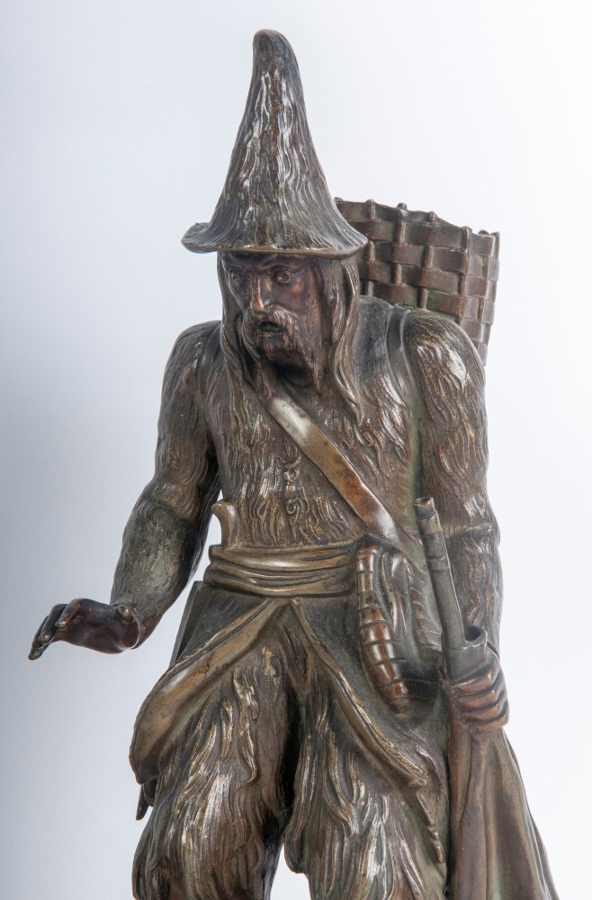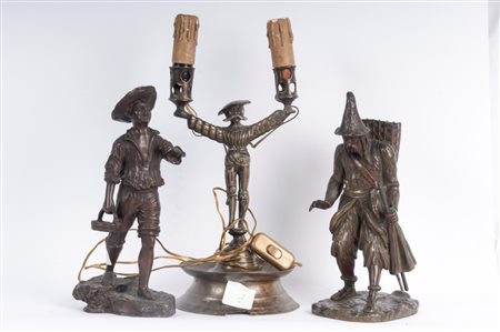 candeliere antropomorfo a due luci elettrificato 30 x 16 cm; ragazzo con cestino firmato alla base 28 x 13 x 7 cm; cacciatore con cappello e zaino 28 x 13 x 10,5 cm