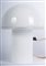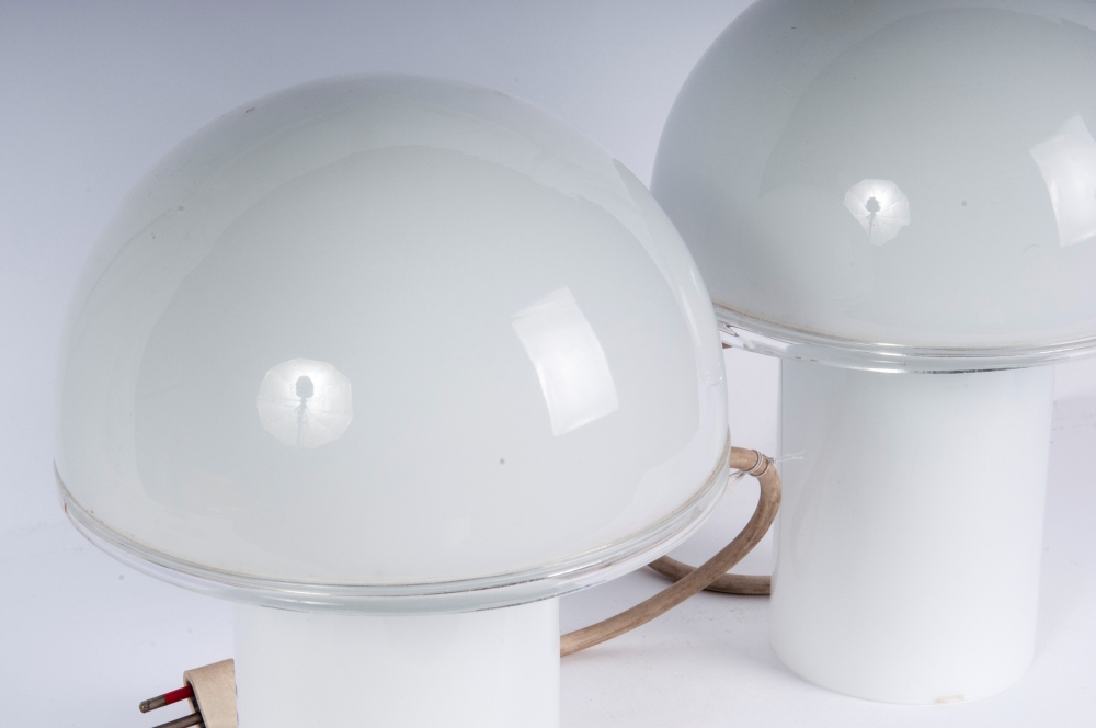 25 x 17 cm dalla tipica forma a fungo in vetro di Murano soffiato opalino, con finitura a bianco ed un bordo di vetro cristallino trasparente. Su disegno di Luciano Vistosi prodotte da Artemide.