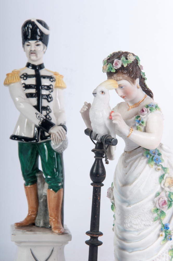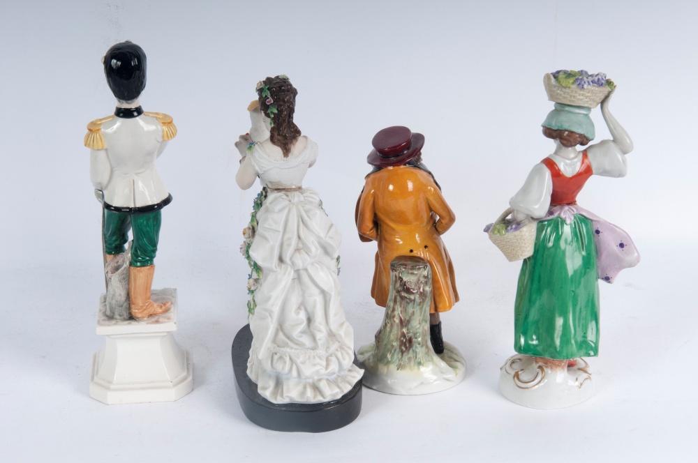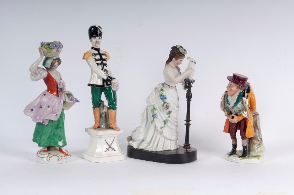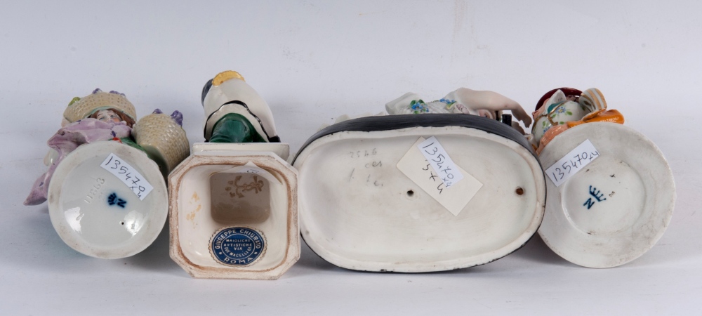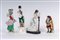 due maschili e due femminili in ceramica policroma: due fanciulle con cesta di frutta 18 x 5,5 cm e l'altro con pappagallo 18 x 11,5 x 7 cm; uno un gobbo portafortuna 13,5 6,5 cm e l'altro e militare in uniforme 20 x 6 cm.
