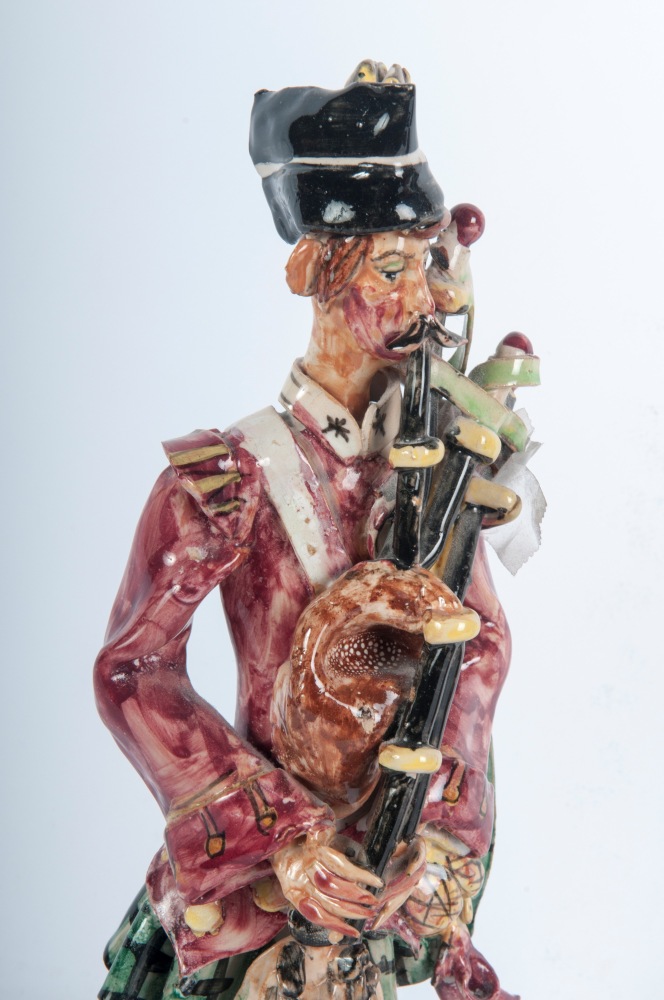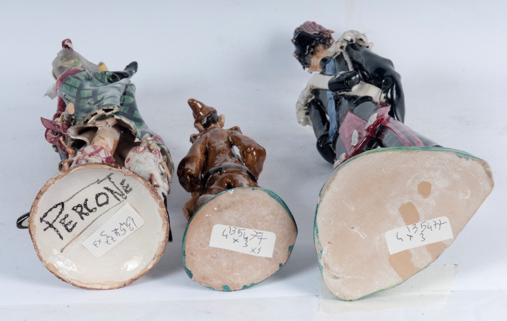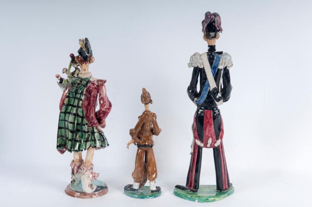 un carabiniere 32,5 x 12 x 7,5 cm, uno suonatore di cornamusa 27 x 7,5 cm; un soldato di fanteria 20 x 6 cm. Manifatture siciliane ( B.M.C.A. Percone) Caltagirone