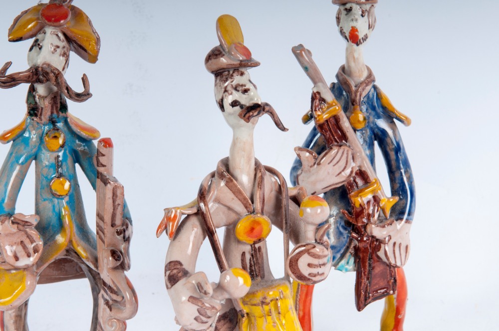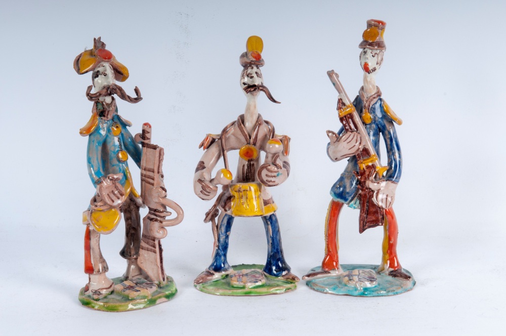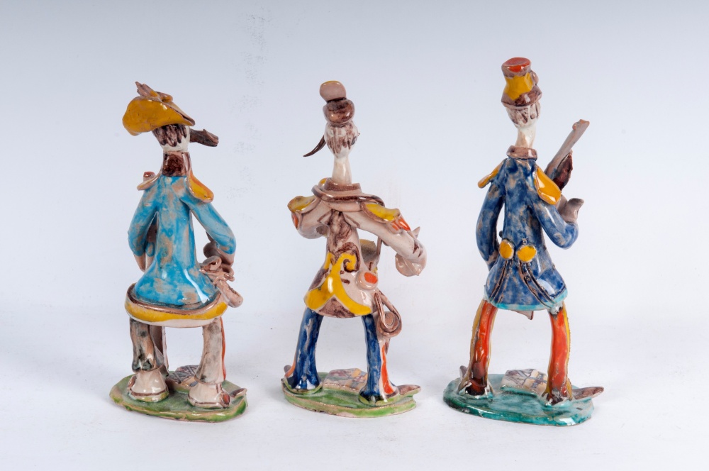 Lotto di tre figure militari stilizzate in ceramica policroma:
