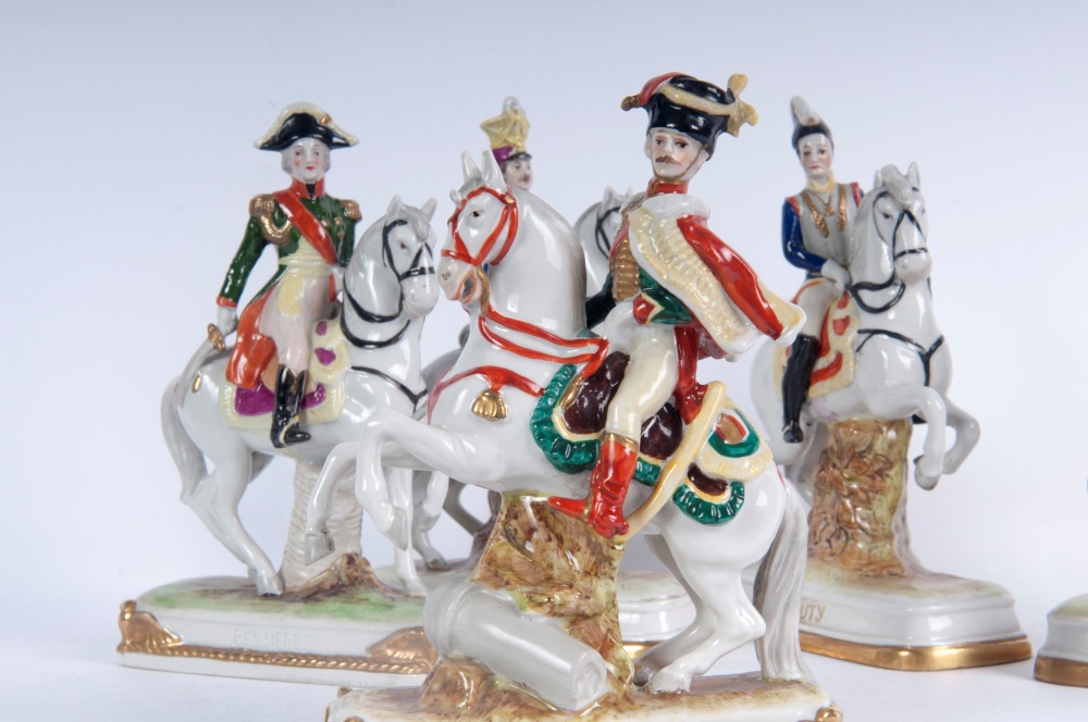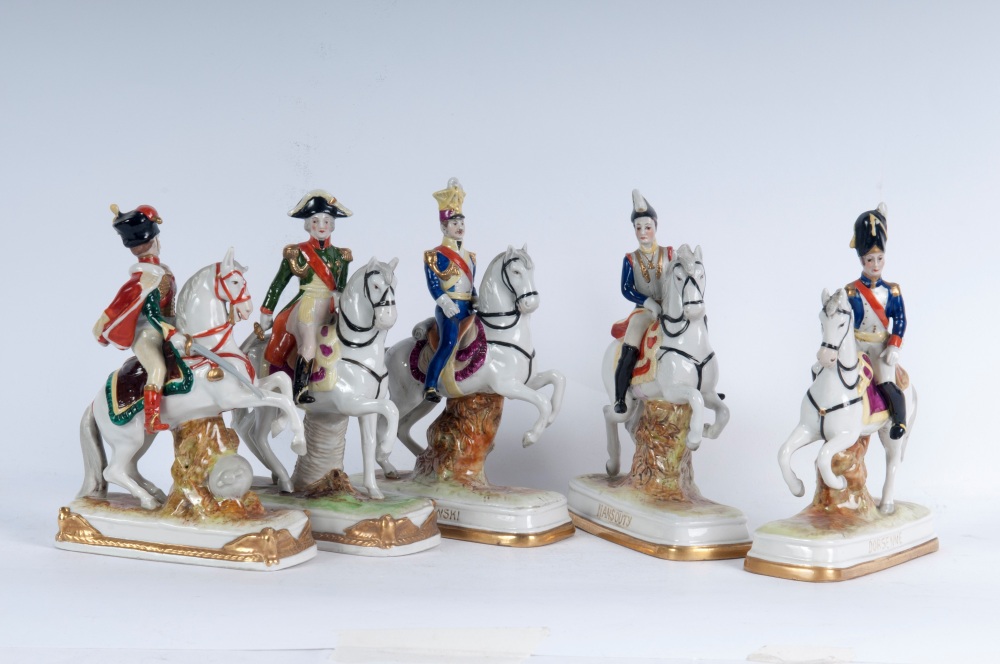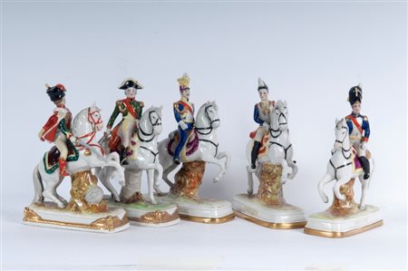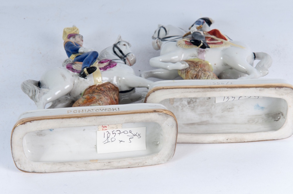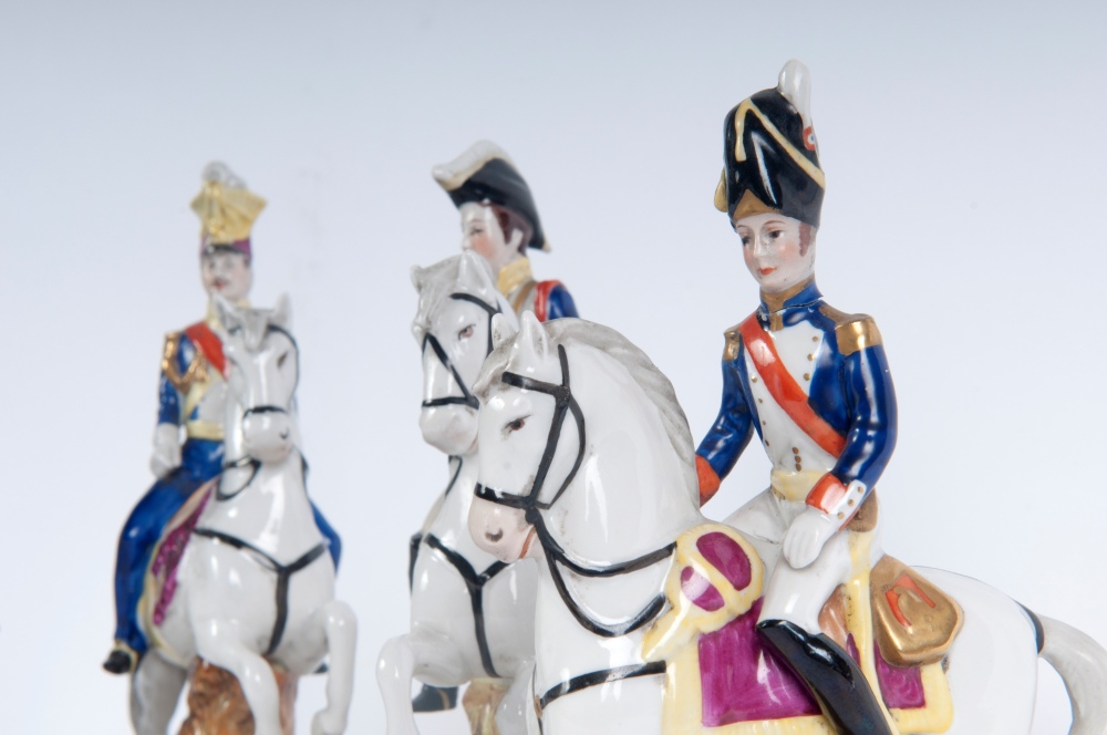 16 x 12 x 5 cm figure militari a cavallo, formatura a colaggio. Manifattura " N" coronata in blu sotto smalto