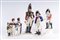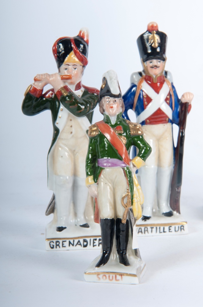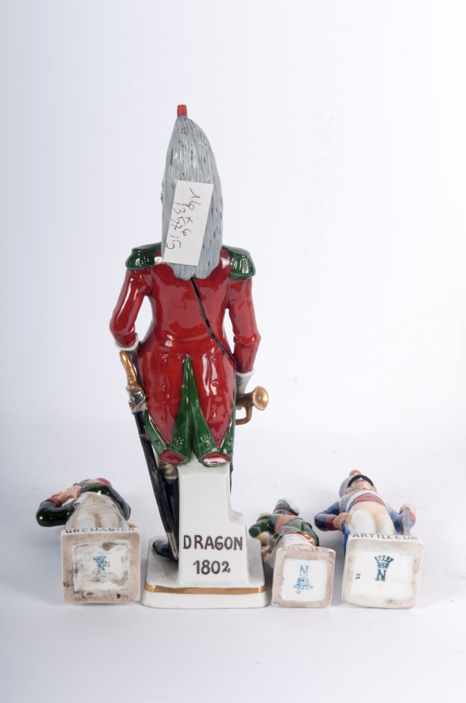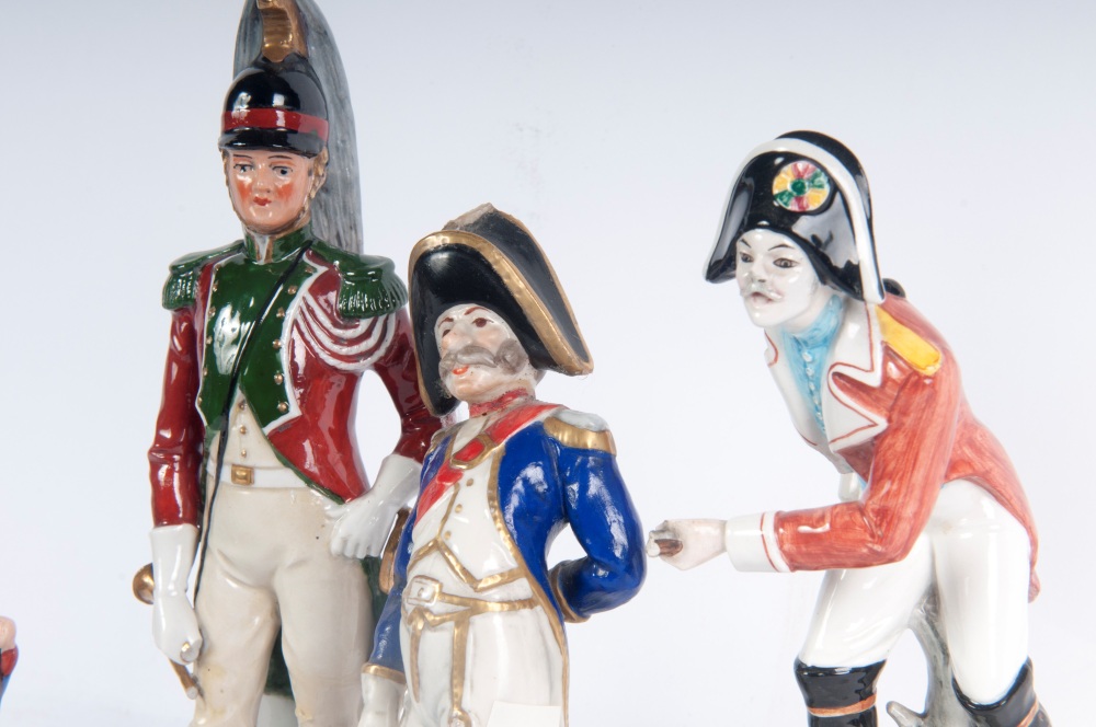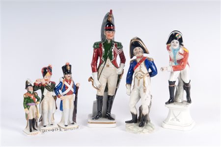 22 x 6 x 5,5 cm; 10 x 2,5 x 2,5 cm figure militari, formatura a colaggio. Manifattura "N" in blu coronata sotto smalto.