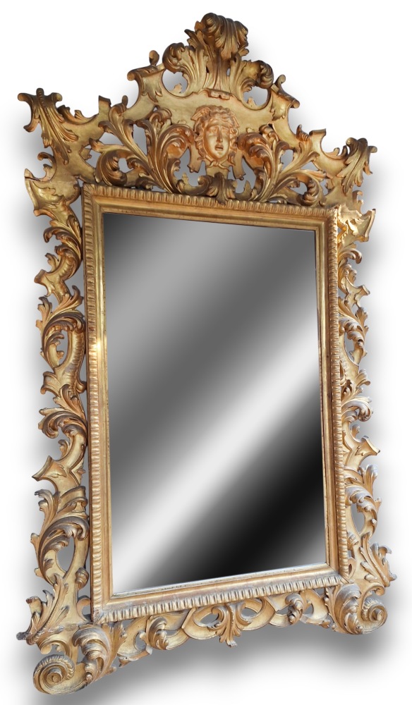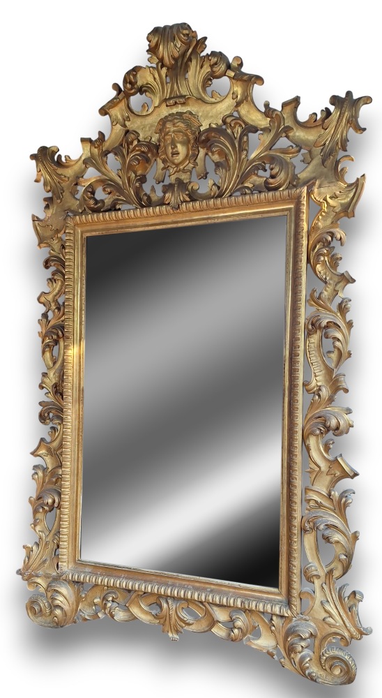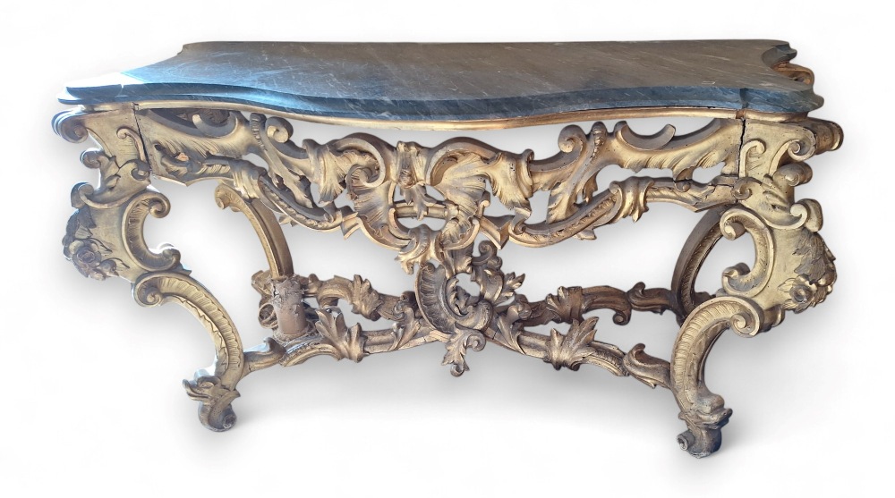 Altezza x larghezza x profondità: 100 x 180 x 80 cm. in legno intagliato e dorato, piano in marmo portoro. Specchiera intagliata a motivi vegetali con mascherone centrale.