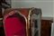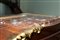 142 x 60 x 32 cm in legno di mogano. Con piedi anteriori a sciabola e fianchi rastremati verso il centro. Piano in breccia rossa delle Alpi con guarniture a ramages sul fronte e sui fianchi.