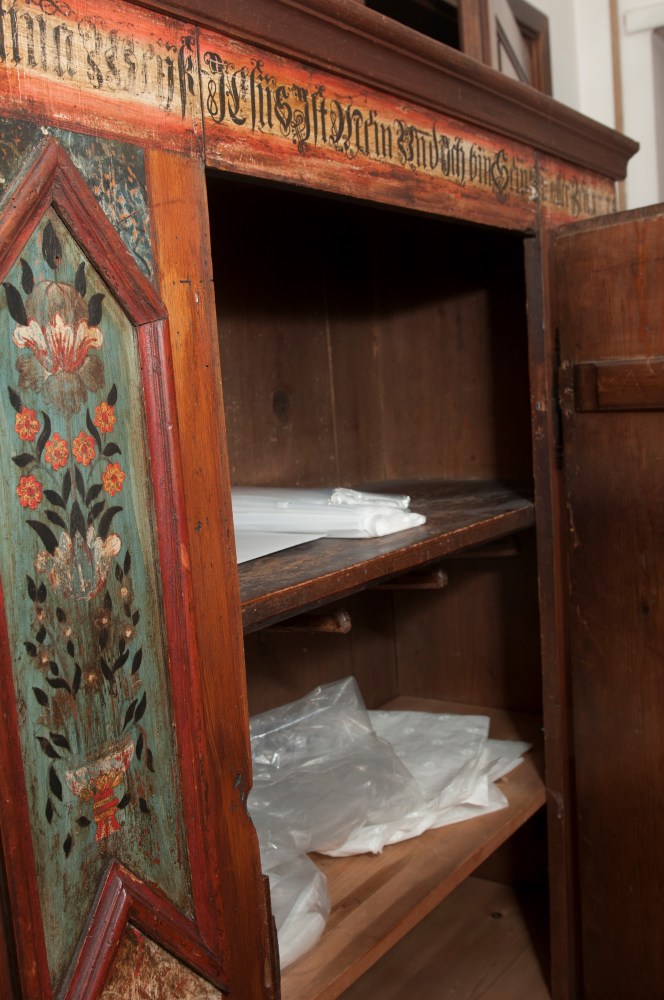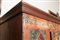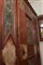 173 x 121 x 45 cm di forma rettangolare in legno di pioppo laccato con decori a motivi floreali. Iscrizione ad inchiostro sotto la cornice del cappello, decori con cornici in legno a motivi geometrici sul fronte della credenza. Interno a tre ripiani.