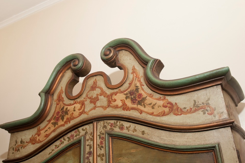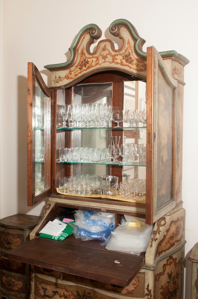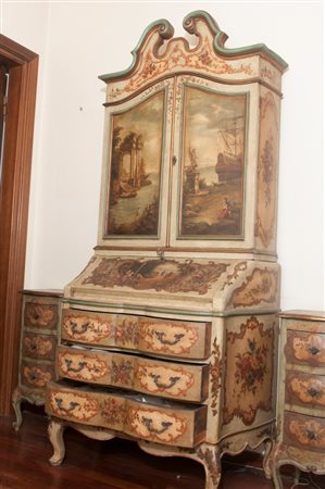 220 x 92 x 57 cm in legno a lacca verde con ribalta ed alzata a due sportelli.